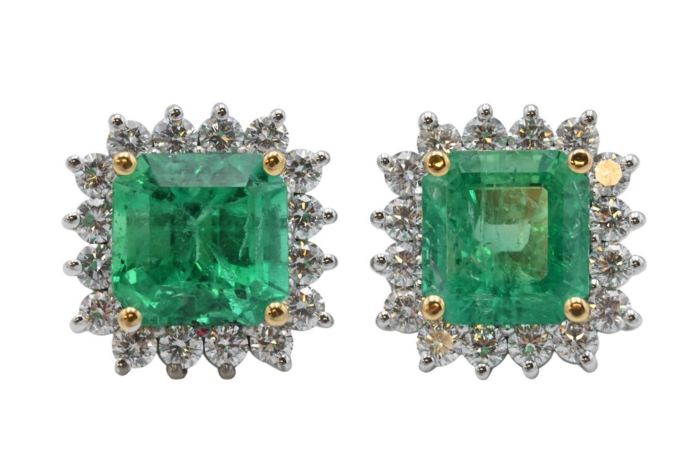 Pair of 18 Karat White Gold and Emerald Earrings, total emerald weight 5.13 carats, surrounded by 32 brilliant cut diamonds, total weight 1.17 carats; along with EGL report and appraisal.