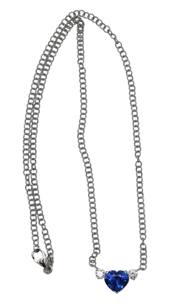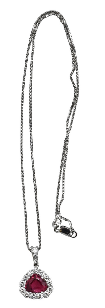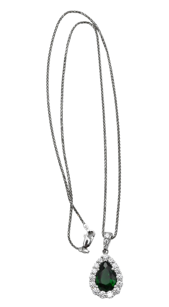 18 Karat White Gold Pendant, containing one pear shaped mixed cut tourmaline, 2.96 carats; surrounded by round cut diamonds; length 15 1/2 inches; along with G.I.A. report on stone.