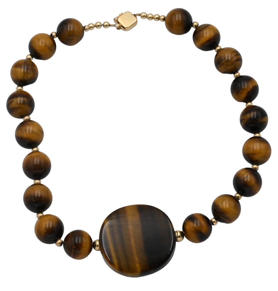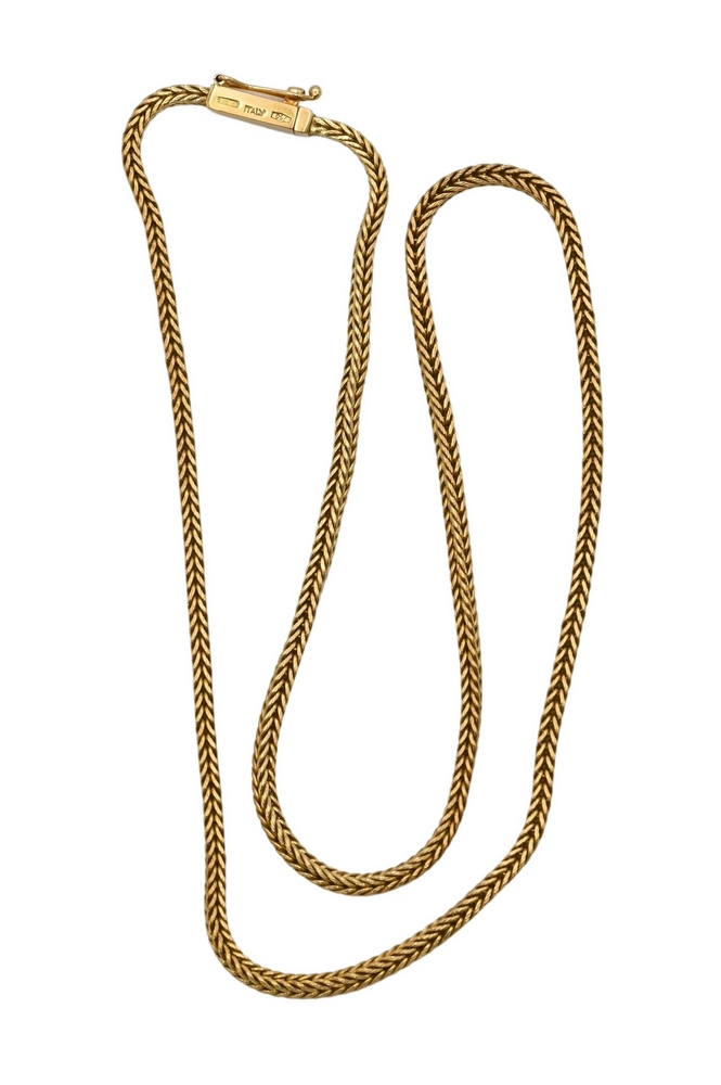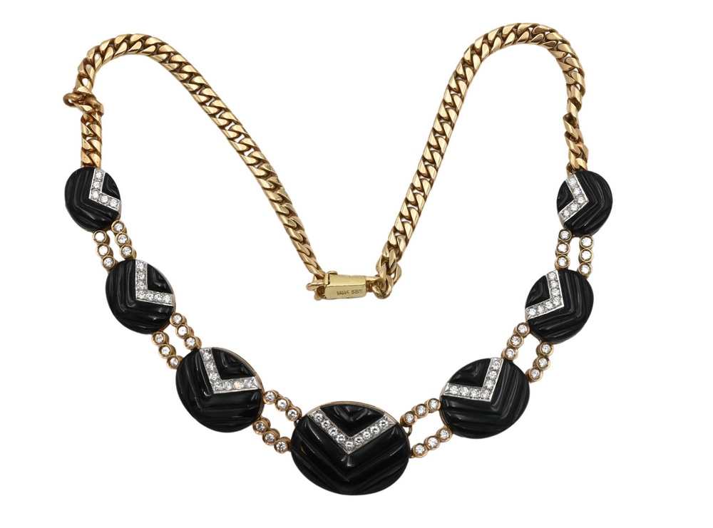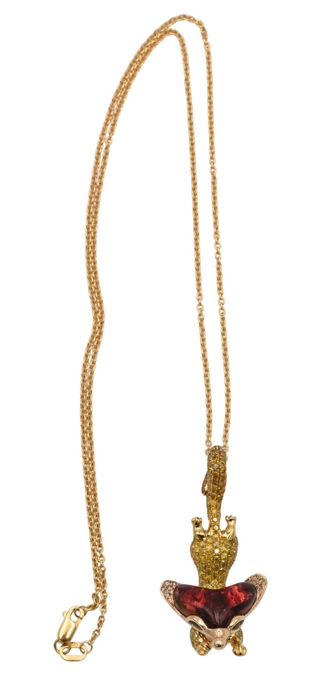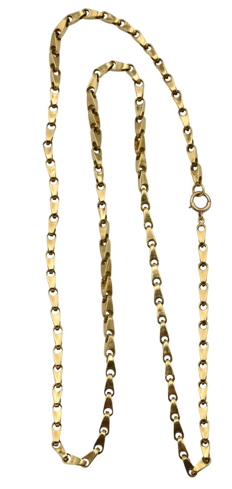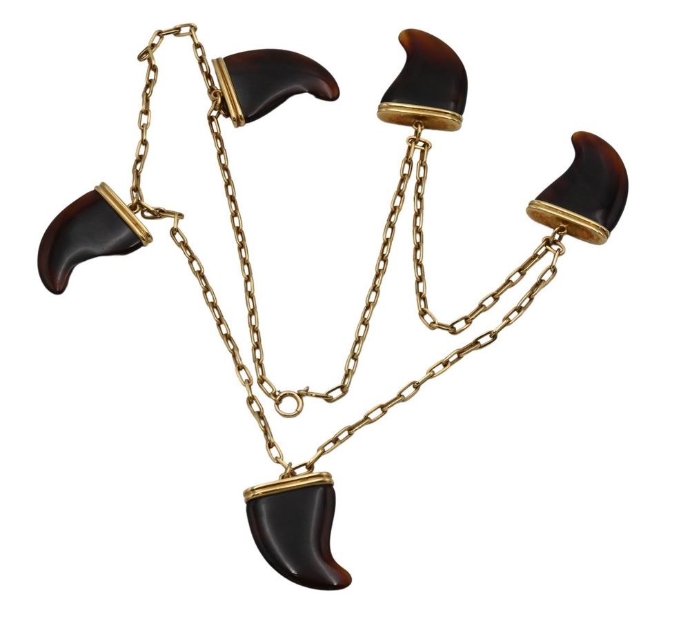 14 Karat Yellow Gold Chain Necklace, mounted with five tooth shaped tortoise style pendants, each with 18 karat gold tops, signed Webb, 72 grams total weight.