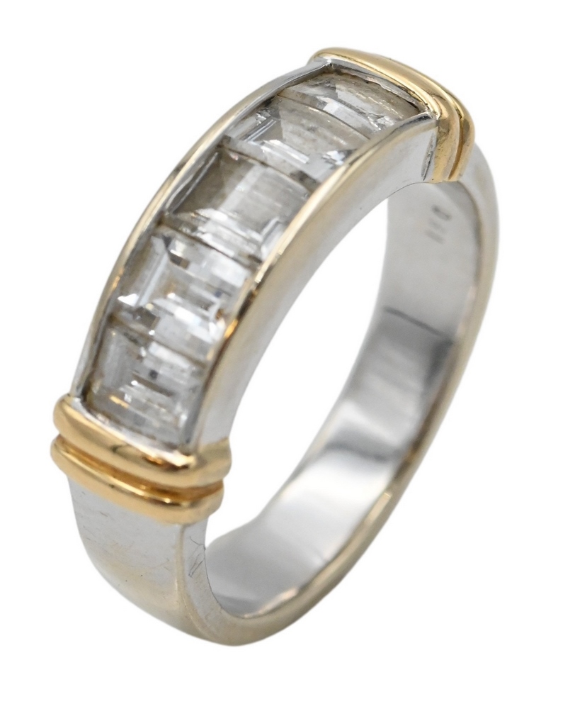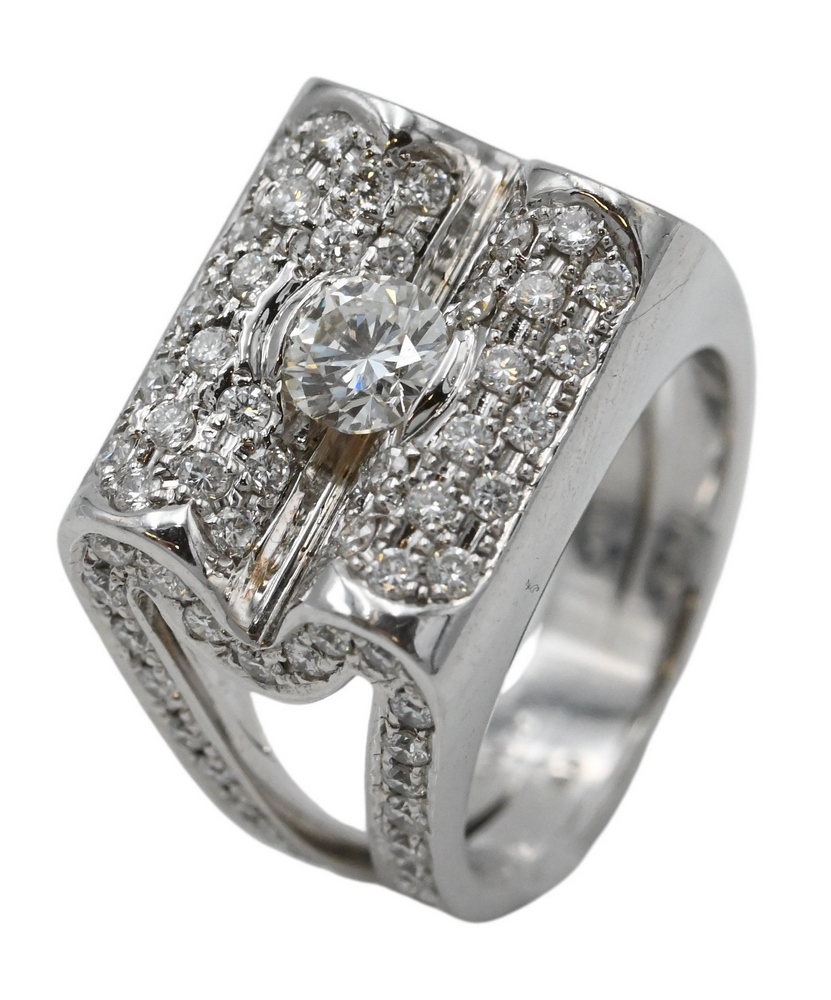 18 Karat White Gold Ring, set with center round diamond, approximately 4.98 millimeter diameter and diamonds under and over center, along with diamonds on either side, size 6 1/2, 12 grams.