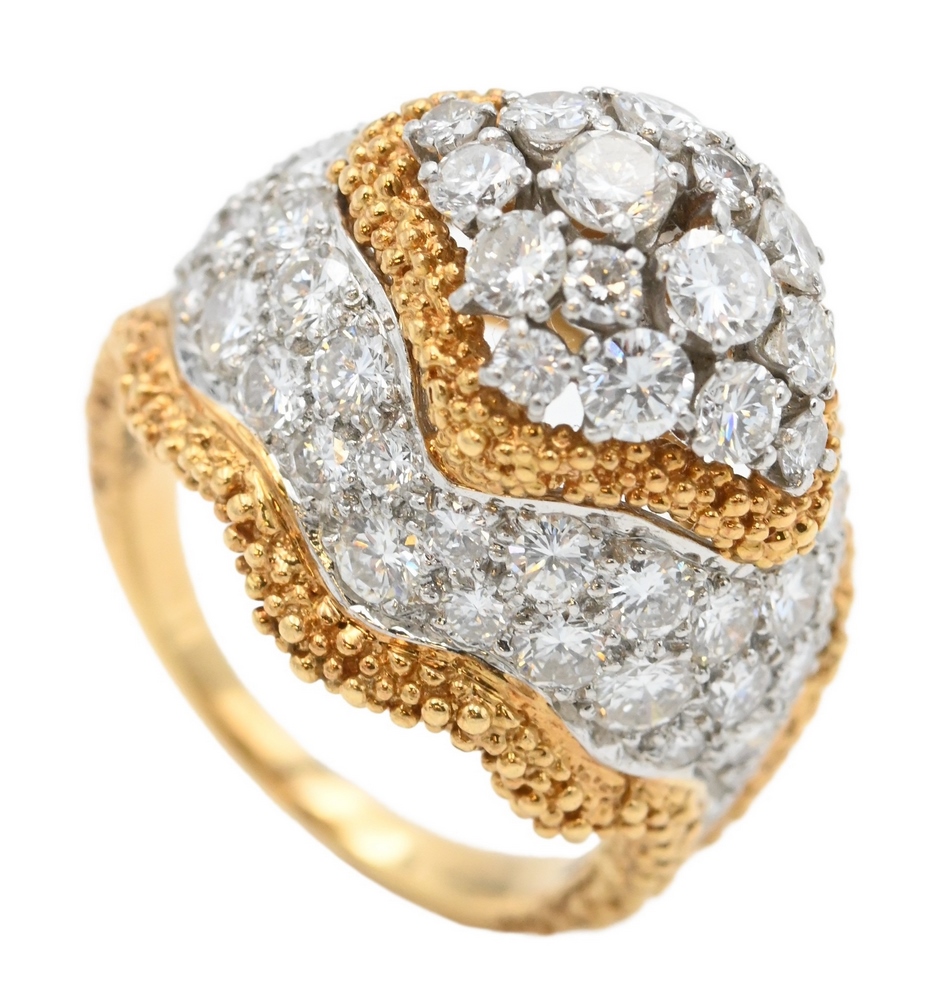 18 Karat Yellow Gold Cocktail Ring, having domed top, set with 16 center diamonds, largest is 3.4 millimeters, set over a layer of approximately 50 fully cut diamonds, size 7, 14 grams.