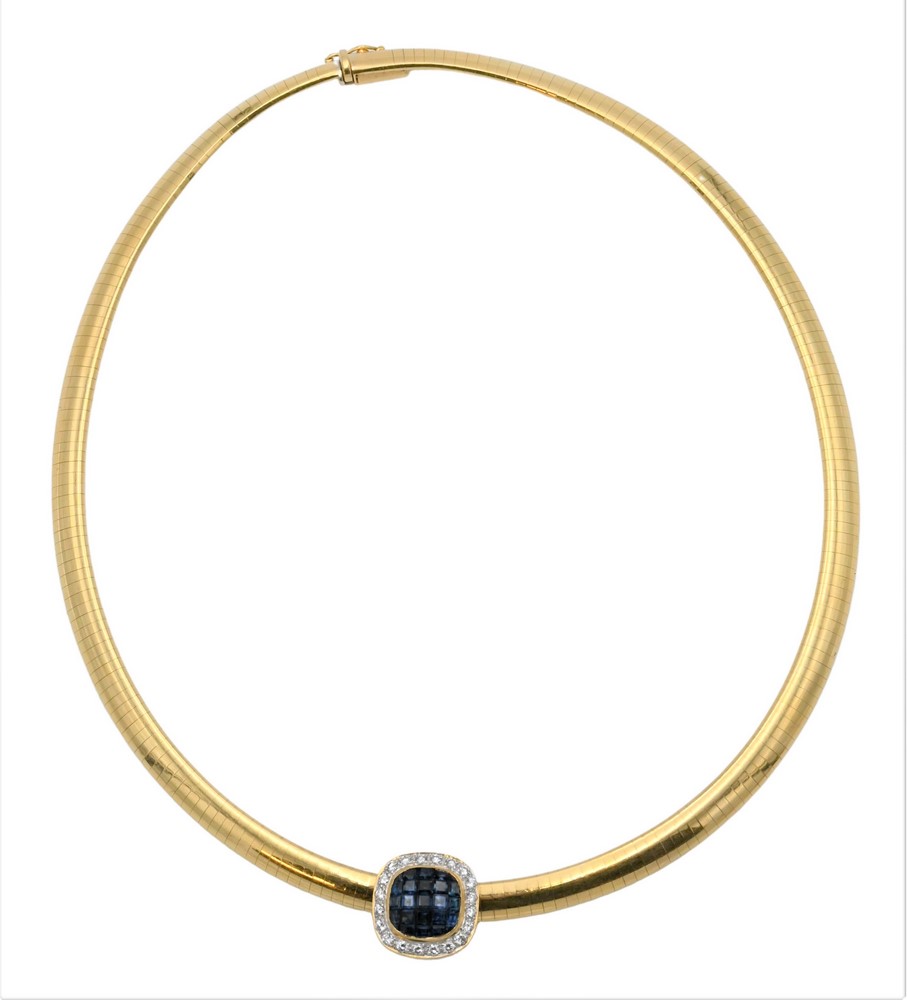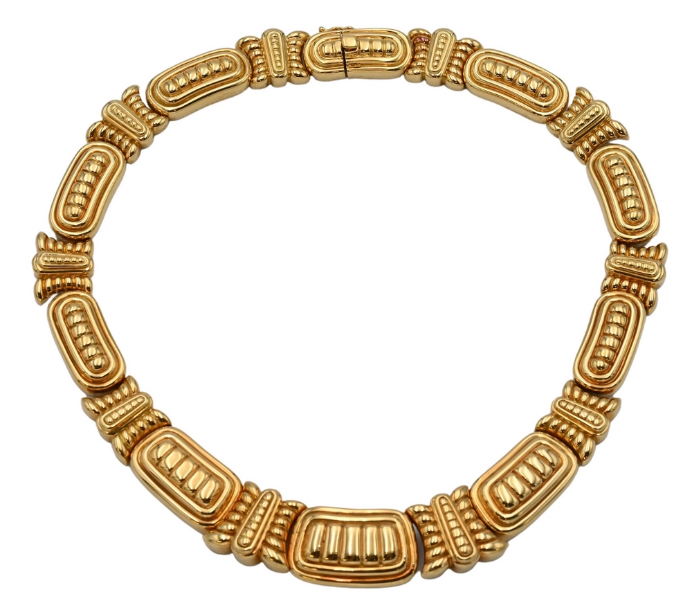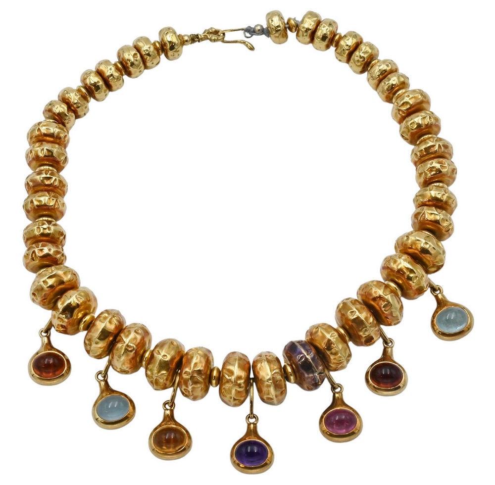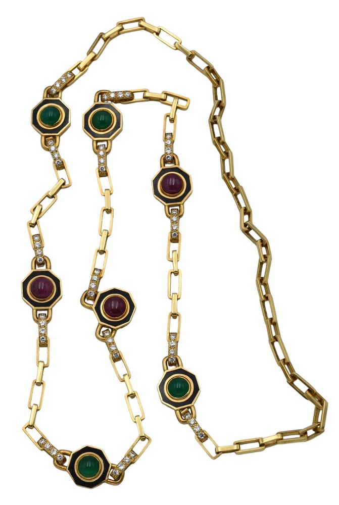 18 Karat Yellow Gold Necklace, mounted with seven medallions, mounted with pink sapphires, green stones, and diamonds on nearest links, attributed to Tambetti, length 28 inches, total weight 91 grams.