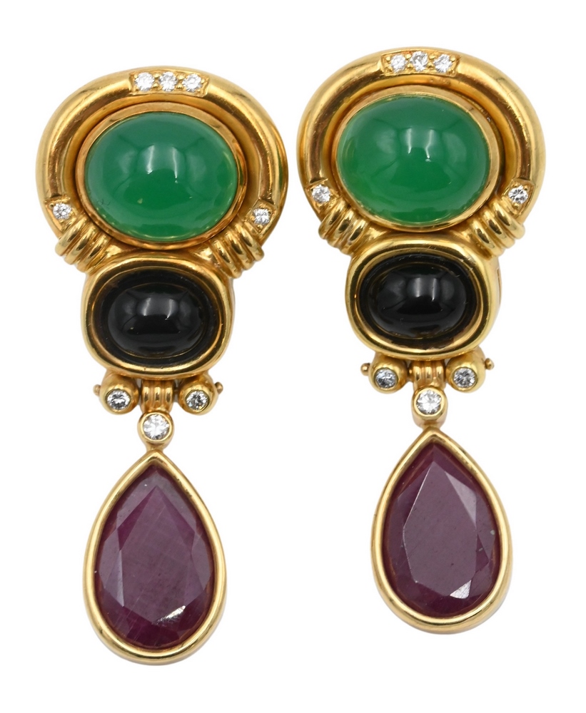 Pair of 18 Karat Gold Earrings, set with faceted ruby? hanging below three diamonds and oval black onyx, along with green stone with five diamonds around green stone, total weight 42.6 grams.