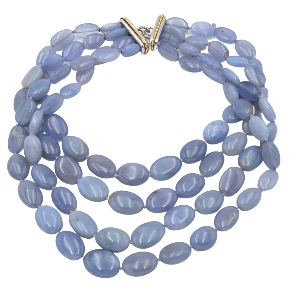 Tambetti Four Strand Necklace, having blue chalcedony with subtle lavender oval stones, along with a white and yellow gold clasp marked 14 karat and 18 karat, length 14 1/2 inches.
