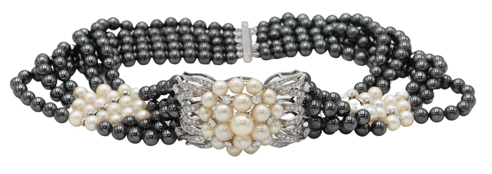 Pearl Five Strand Choker Necklace, black and white pearls, center set with 20 pearls and 96 diamonds, largest pearl being 8.7 millimeters, along with 18 diamonds in spacers and clasp, 104 diamonds total, average pearl is 6 millimeters, all set in 10 karat white gold, length 14 1/2 inches.