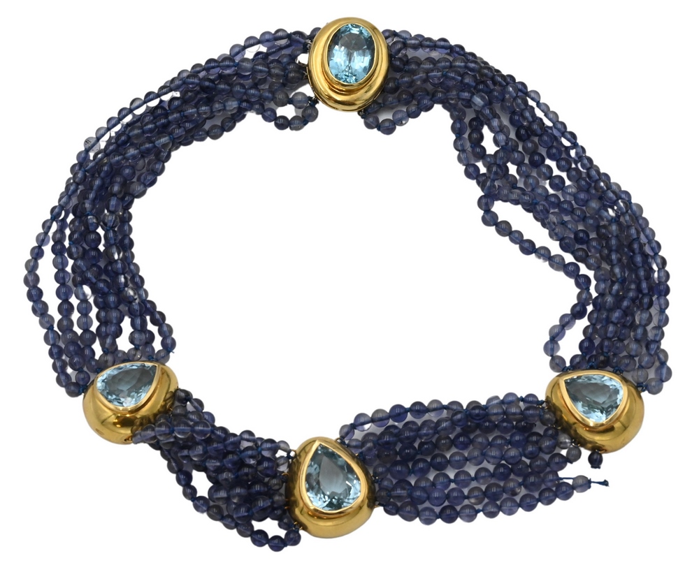 Eight Strand Necklace, having light purple beads, three 14 karat gold centers, each having teardrop blue topazes, along with oval topaz in clasp, topaz’s 14 and 14.8 millimeters respectively, three strands of beads are loose, length 14 1/2 inches.