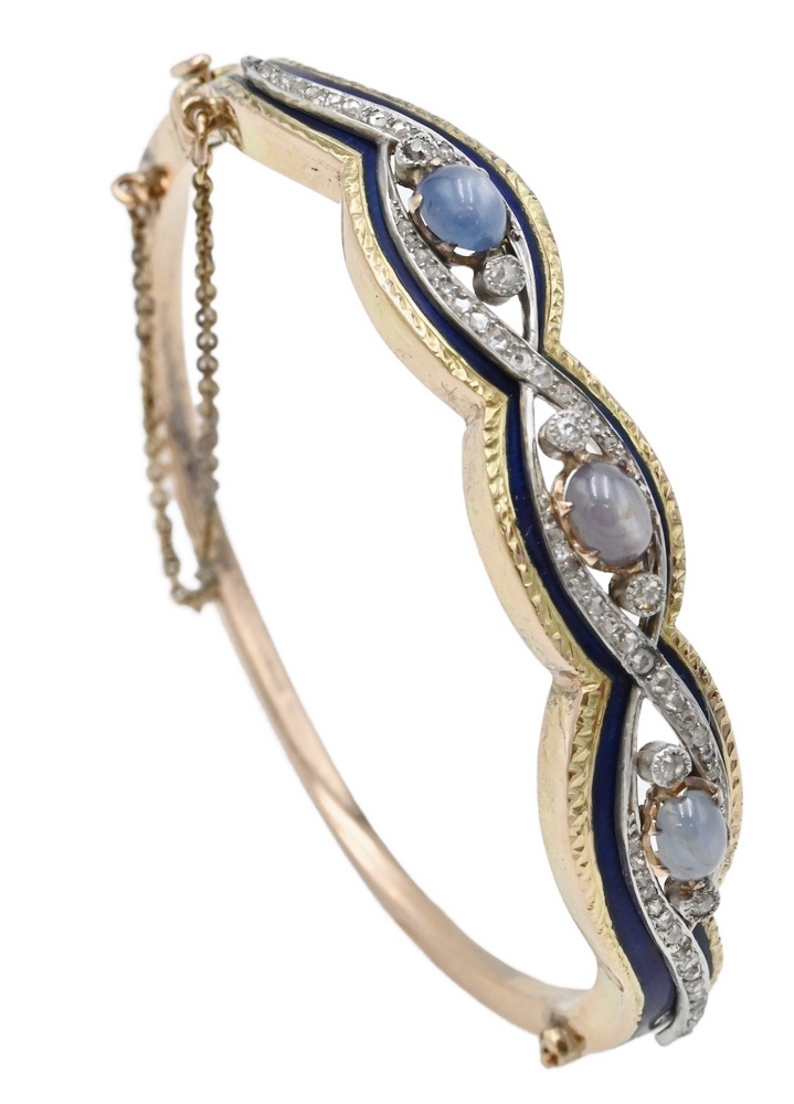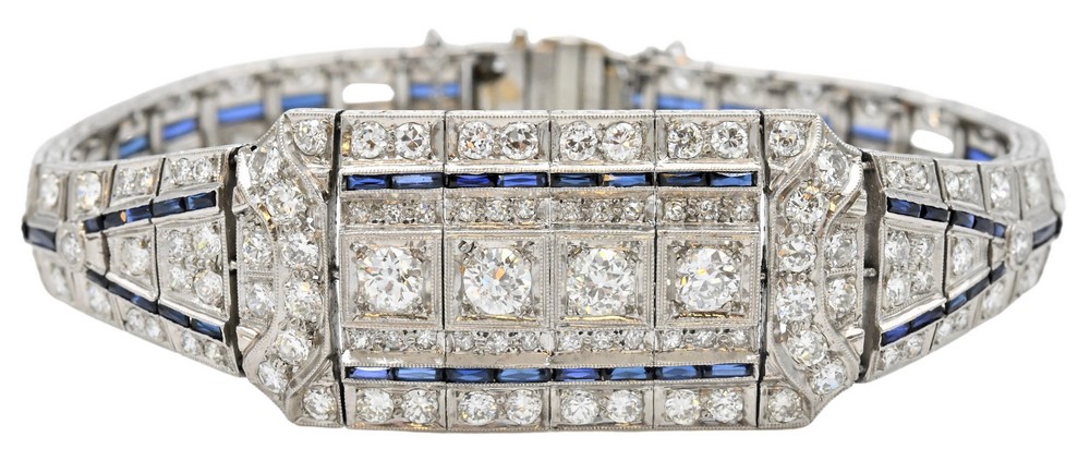 Art Deco Platinum Diamond and Sapphire Bracelet, having 134 diamonds, thin multi cut blue sapphires, 4 center diamonds are approximately .35 carats each, 36 grams total weight.