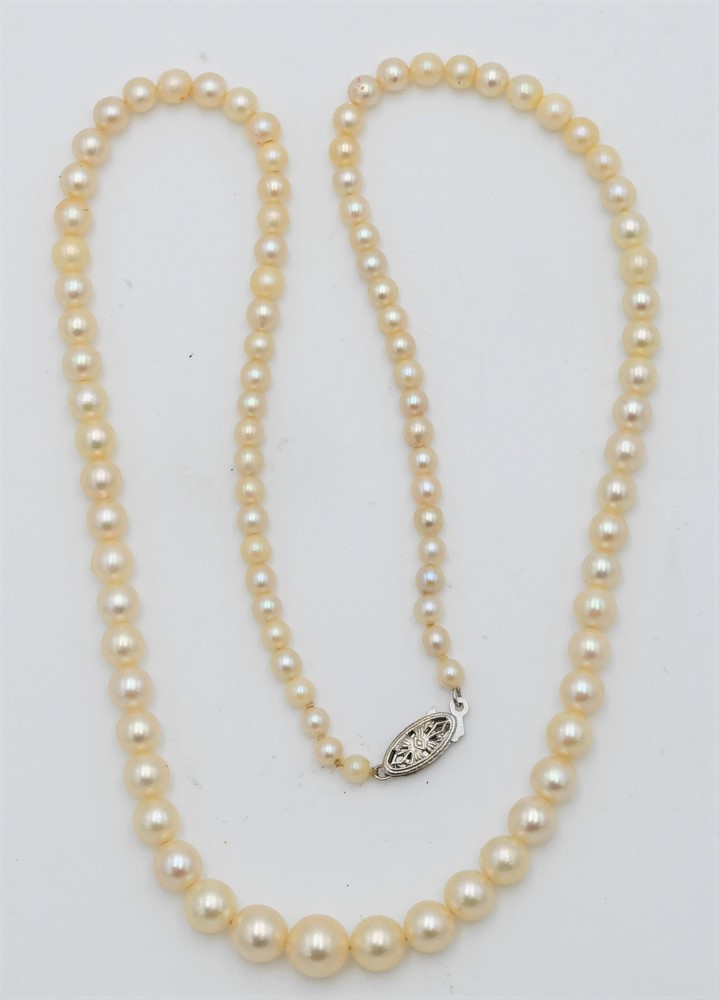 String of Graduated Pearls Necklace, having 14 karat gold clasp, 7.2 and 3.3 millimeters, length 17 1/2 inches, in Dreicer & Company box, 5th Avenue, New York.
