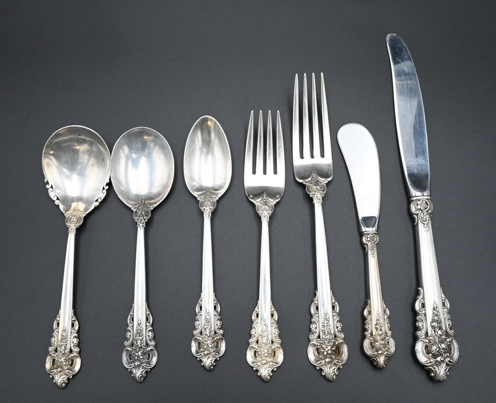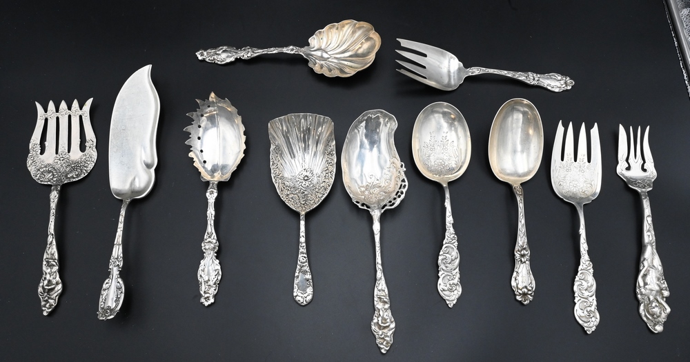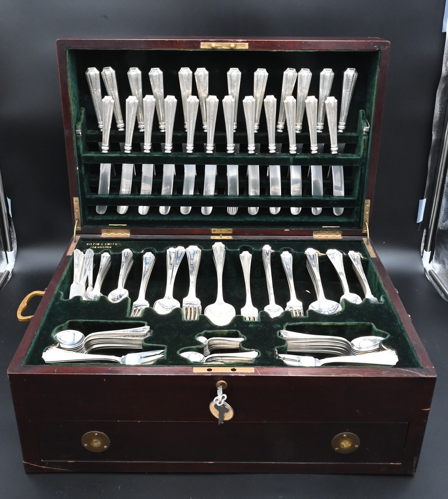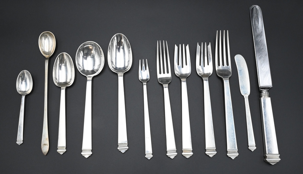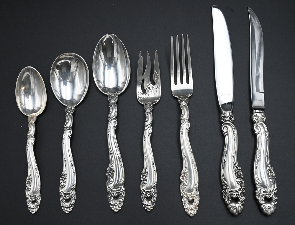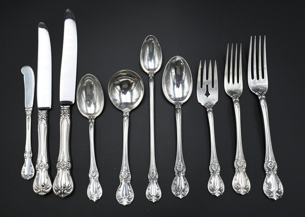 180 Piece Tiffany & Company Sterling Silver Flatware Set, hampton pattern, to include: 12 luncheon knives, 16 dinner knives, 2 large serving spoons, 2 large serving forks, 1 ladle, 2 salt and pepper shakers, 2 salts with cobalt insert, 1 fish server, 3 pie/cake servers, 12 butter knives, 16 dinner forks, 14 soup spoons, 6 iced tea spoons, 24 demitasse spoons, 24 teaspoons, 7 tablespoons, 12 salad forks, 17 fish forks, 1 sugar spoon, 1 sugar tong, 4 small salt spoons, 1 master salt spoon