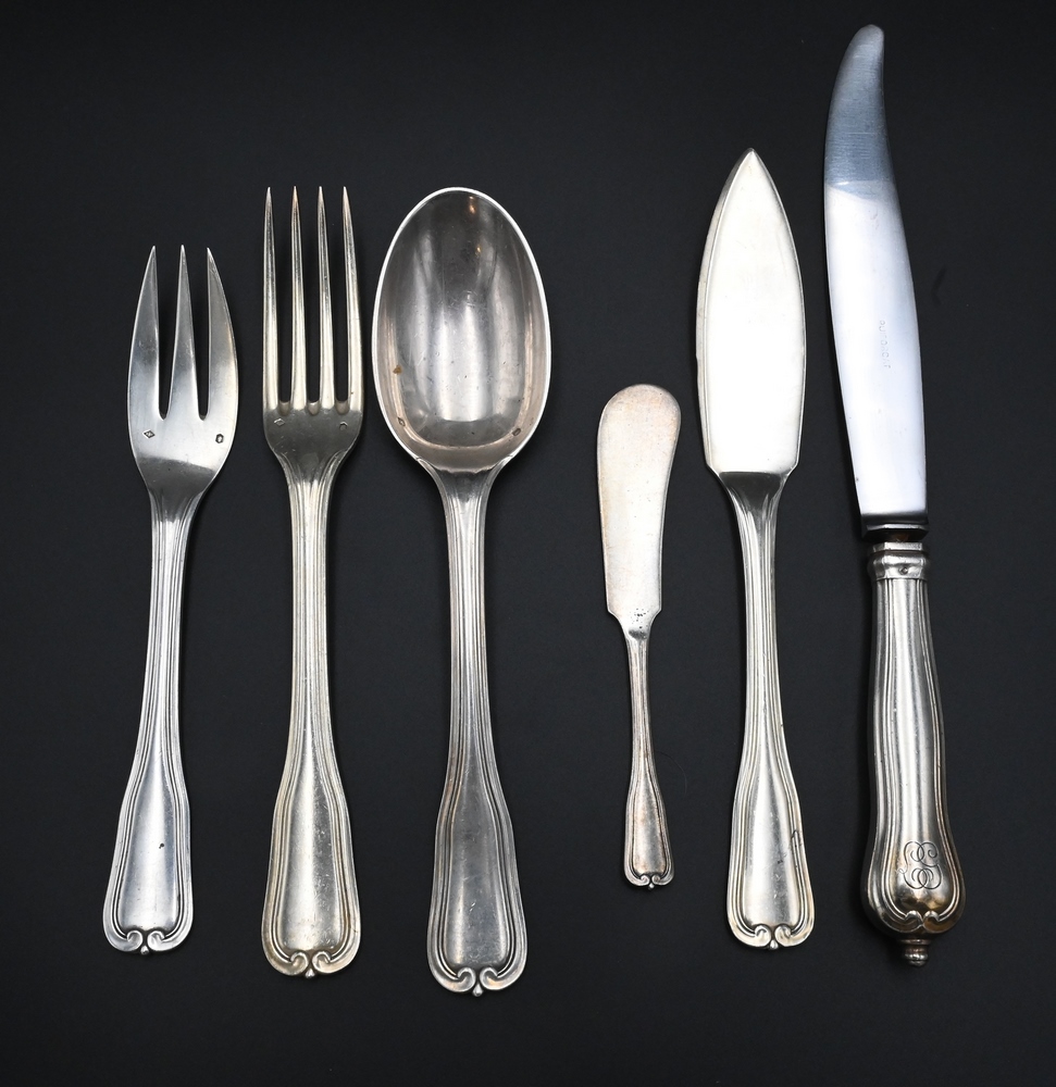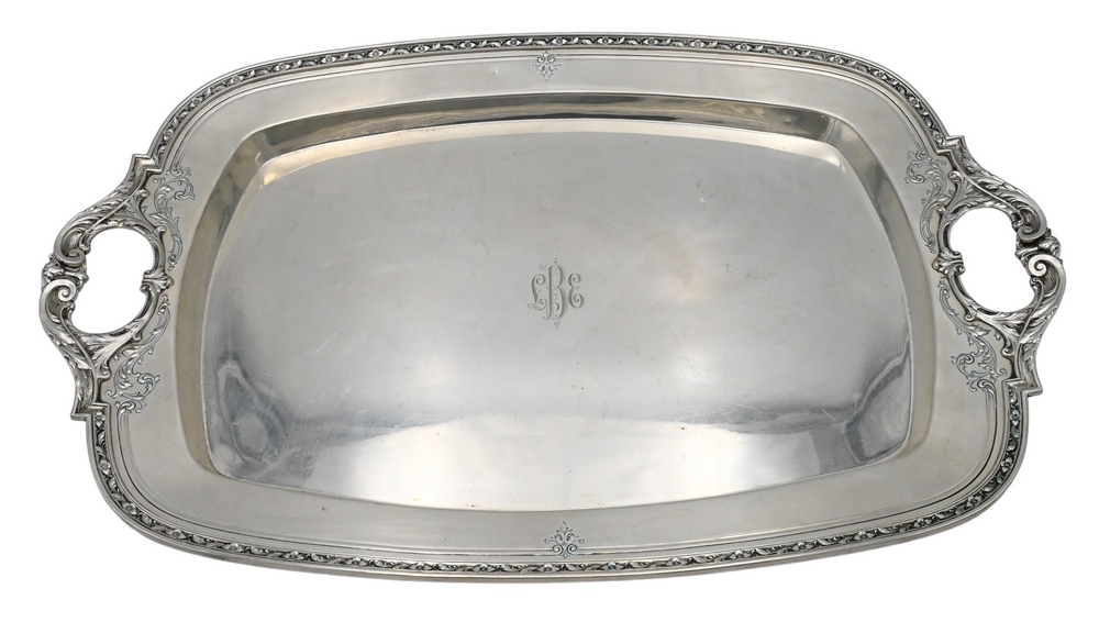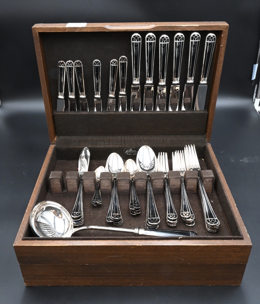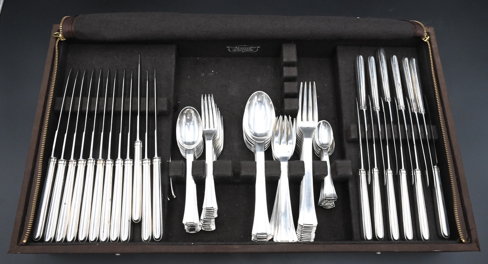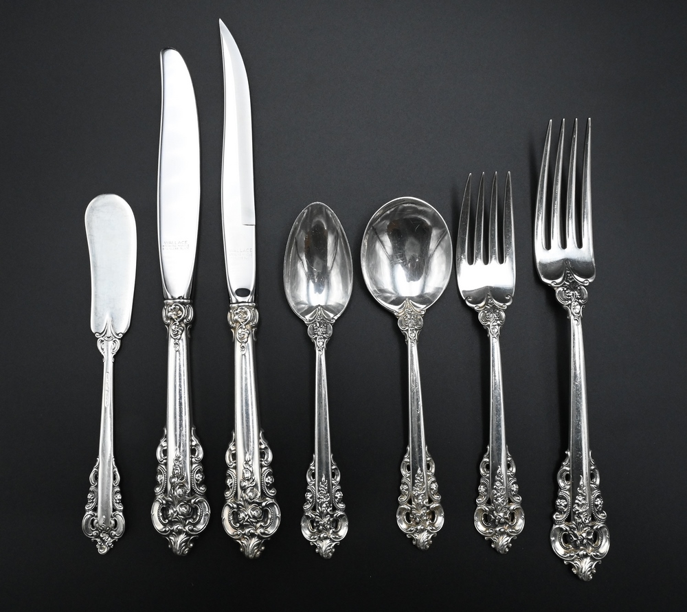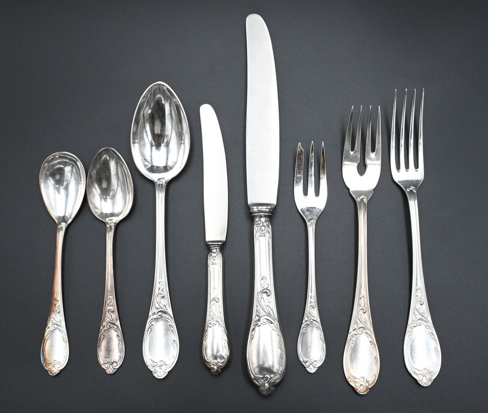 180 Piece Tiffany & Company Sterling Silver Flatware Set, hampton pattern, to include: 12 luncheon knives, 16 dinner knives, 2 large serving spoons, 2 large serving forks, 1 ladle, 2 salt and pepper shakers, 2 salts with cobalt insert, 1 fish server, 3 pie/cake servers, 12 butter knives, 16 dinner forks, 14 soup spoons, 6 iced tea spoons, 24 demitasse spoons, 24 teaspoons, 7 tablespoons, 12 salad forks, 17 fish forks, 1 sugar spoon, 1 sugar tong, 4 small salt spoons, 1 master salt spoon