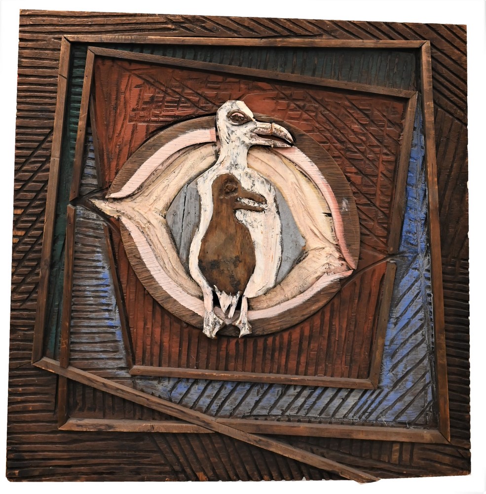 Bernard Langlais (American, 1923 – 1977), The Gull of the Inner Eye, wood relief with paint, 1969, unsigned, 48″ x 48″ overall, remnants of original paper label on verso along with a Galeria De Arte label, (as is with wood loss).