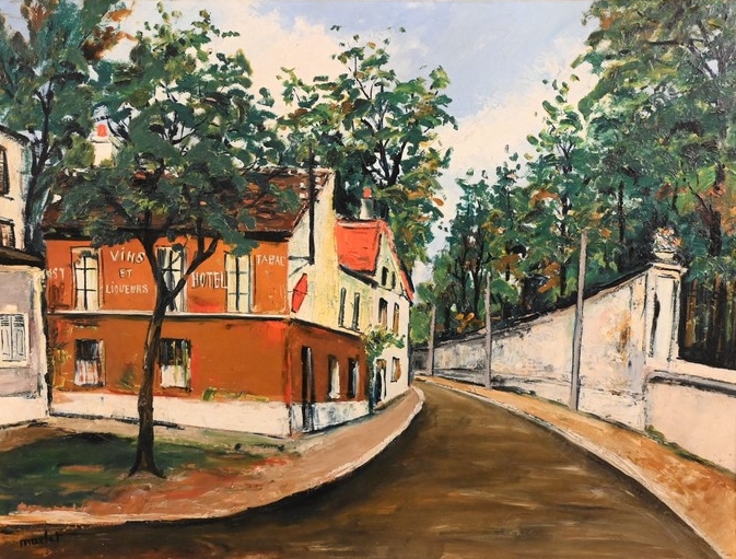 Elisee Maclet (1881 – 1962), oil on board, Street Scene, Hotel, Vins Et Liqueurs, signed lower left Maclet, Christie’s tag on back dated February 13, 1991, lot 44, Puttick and Simpson label on back, 18″ x 24″.