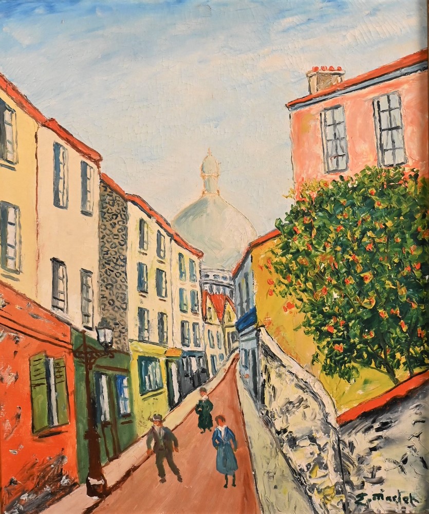 Elisee Maclet (1881 – 1962), oil on canvas, Montmartre La Rue Saint Rustique et le Sacre Coeur, signed lower right E. Maclet, Christies tag on back, 21 1/2″ x 18″.