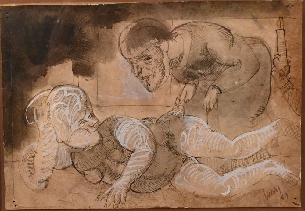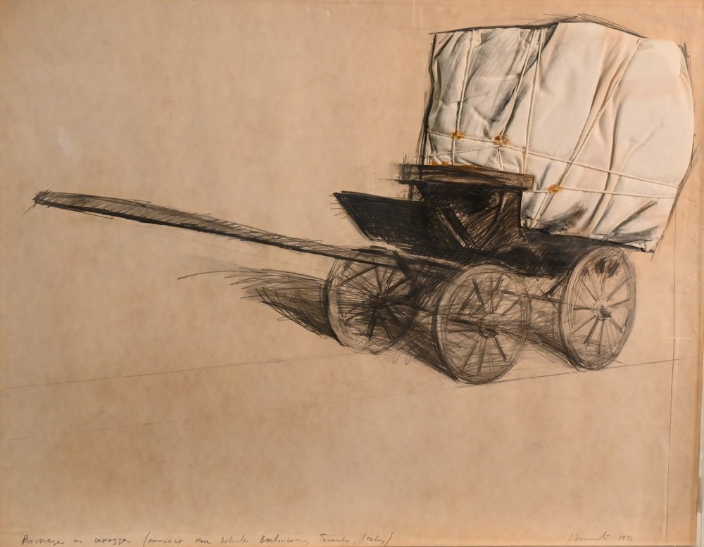 Christo (1935 – 2020), original piece, wrapped, “Package on Carozza, Project for A Chile Berdinger, Taranto, Italy”, 1971, mixed media, pencil, cloth, and string, 3 dimensional on cardboard in plexiglass box, signed lower right, title across bottom in pencil, this piece is registered at the Christo & Jeanne-Claude archive, 22 1/4″ x 28 1/4″. Provenance: Property from the Estate of Alexis Gregory, Sold to Benefit the Alexis Gregory Foundation.