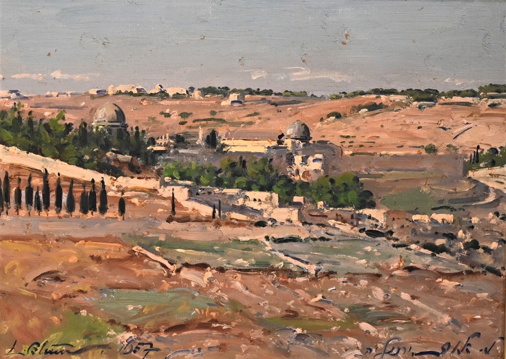 Ludwig Blum (1891 – 1971), Jerusalem landscape, oil on canvas, signed lower left L. Blum, Safari Art Gallery Jerusalem stamp on stretcher, 13″ x 18 1/8″.