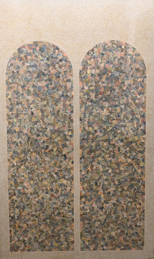 Jiri Kolar (1914 – 2002), Arches 1967, collage on paper made up of currency, does not appear to have a signature, 78 1/2″ x 47″. Provenance: Solomon R. Guggenheim Museum label, Jiri Kolar Exhibition.
