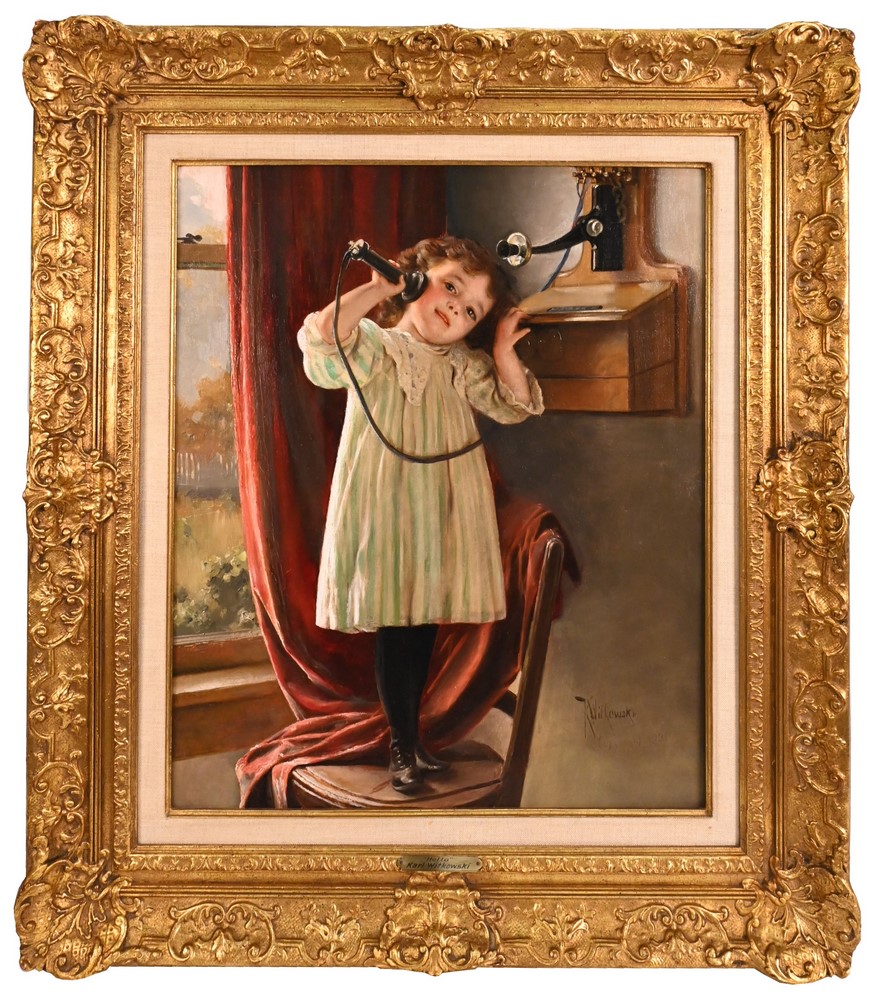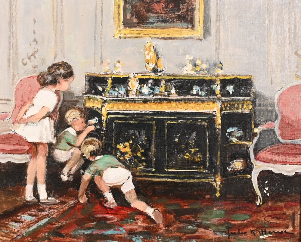 Jules Rene Herve (French, 1887 – 1981), Children at Play, oil on canvas, signed lower right “Jules R. Herve”, also signed on back of canvas, 13″ x 16″. Provenance: Sotheby’s Arcade, New York, October 9, 1992, lot 221; Private collection, New York City, acquired from the above with a copy of the receipt for $3,080.