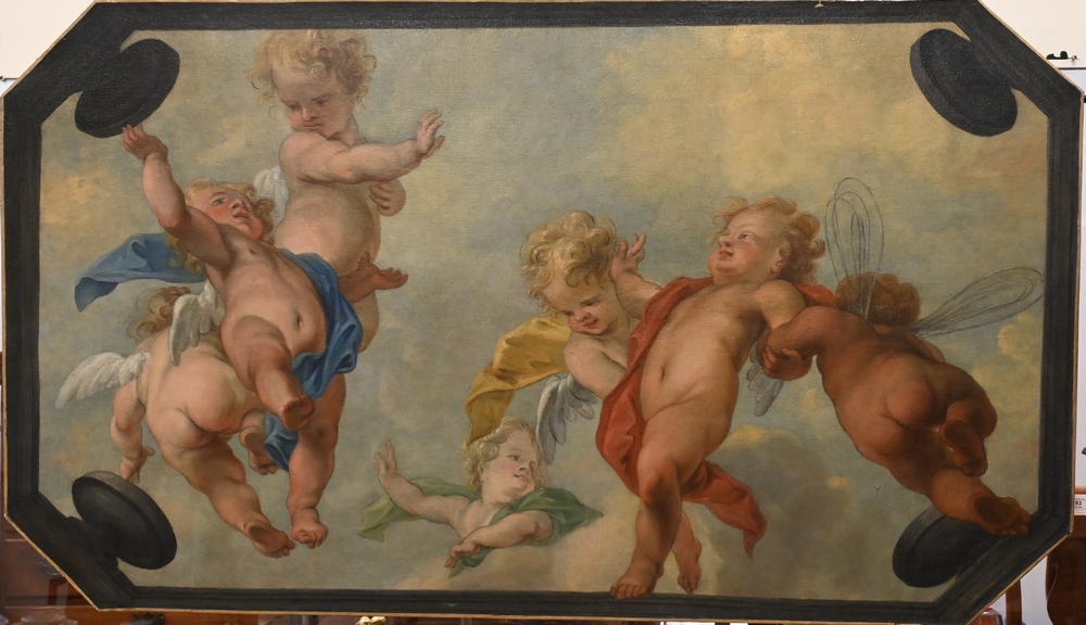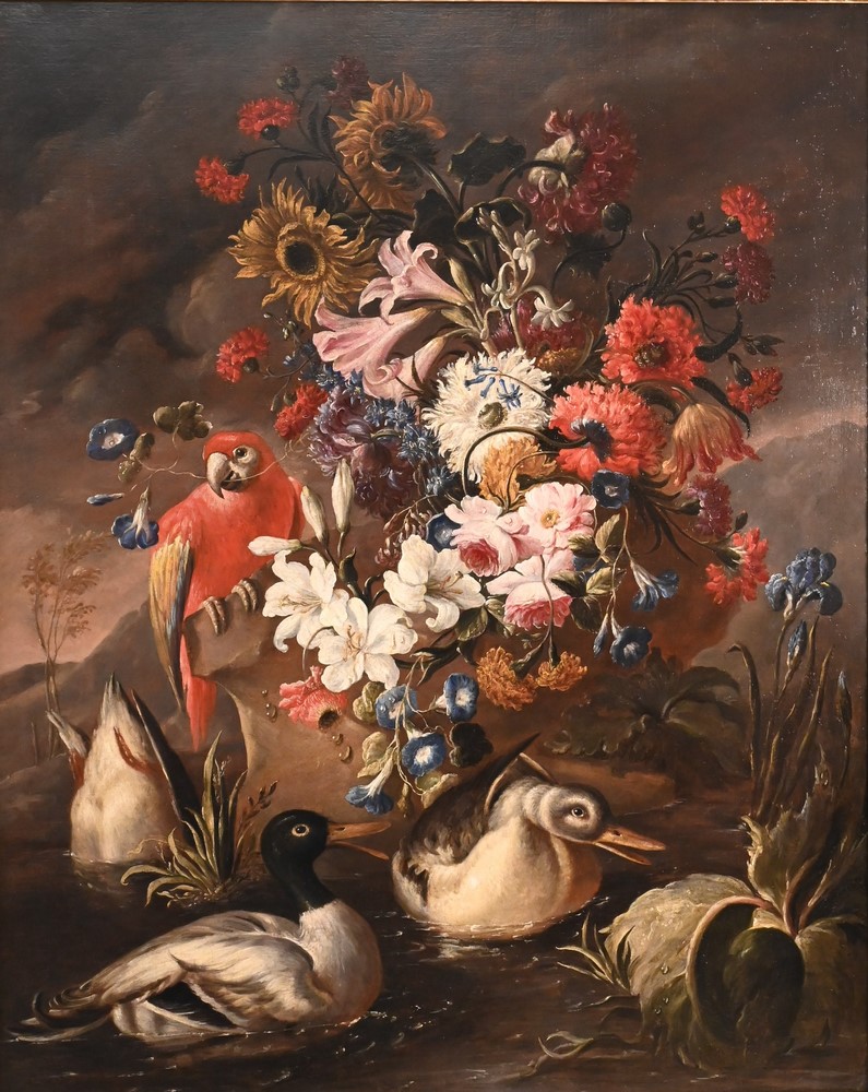 Attributed to Andrea Belvedere (1642 – 1732), floral still life with a parrot and ducks, oil on canvas, unsigned, 49 1/2″ x 39 1/4″. Provenance: Offered for sale by Sotheby’s, important old master paintings and sculpture sale, January 26, 2012.