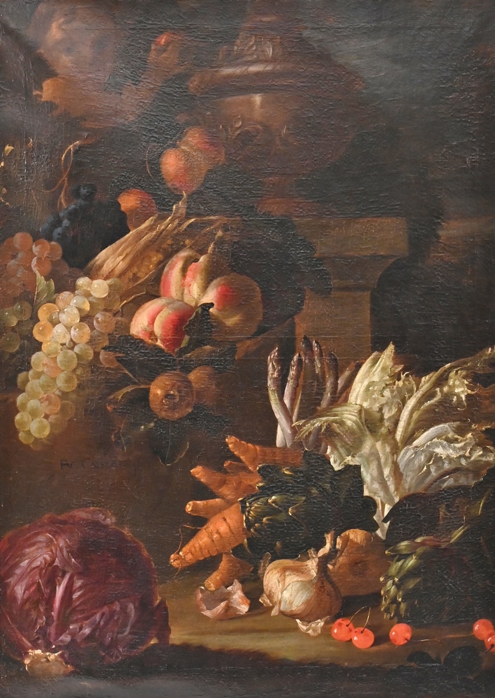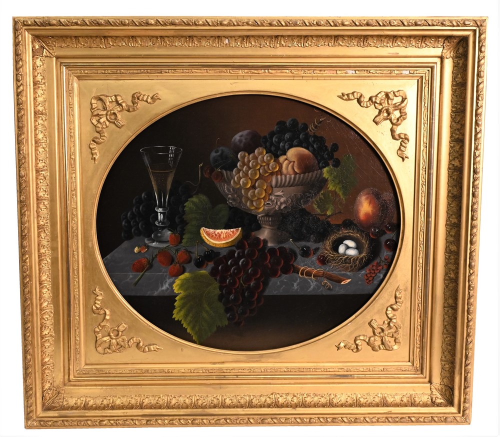 In The Manner of Severin Roesen (1815 – 1872), still life with birds nest, oil on canvas laid on board, unsigned, 18″ x 21″ oval. Provenance: Sotheby’s Arcade, sale 1279, lot 24, 4/14/89.