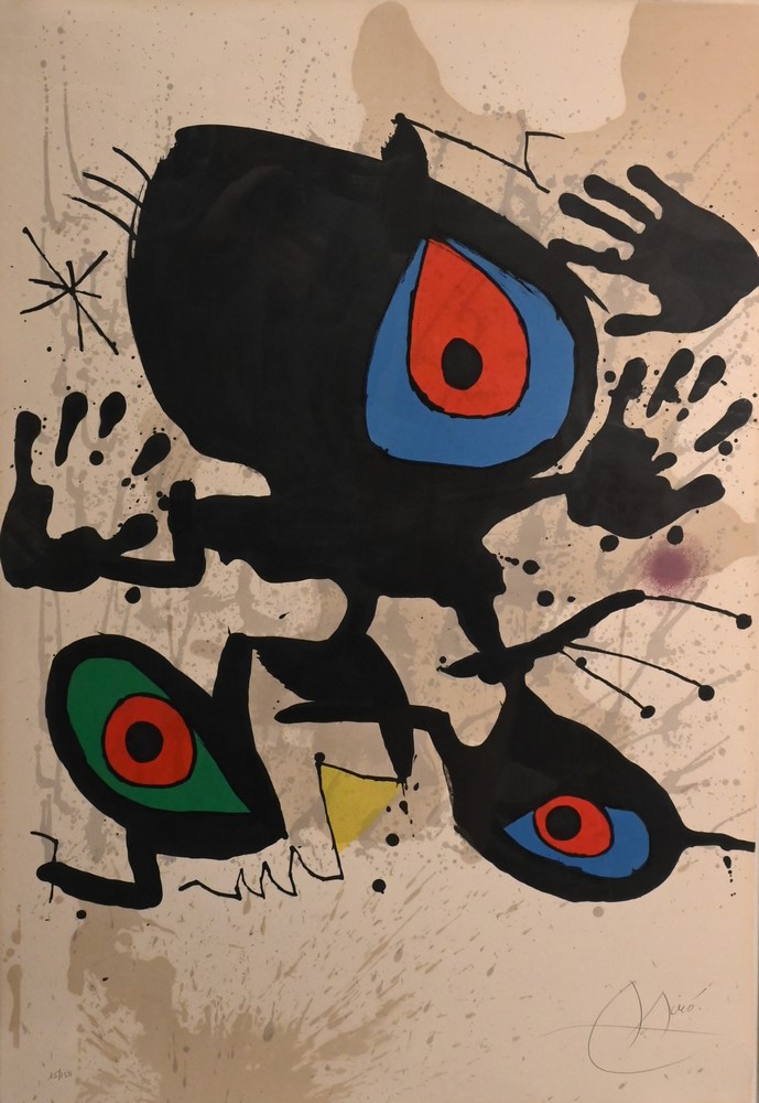 Joan Miro (1893 – 1983), Homage to Miro, 1974, abstract color lithograph, numbered in pencil lower left 15/150, signed in pencil lower right “Miro”, 35″ x 24″. Provenance: From The Museum of Modern Art, New York.