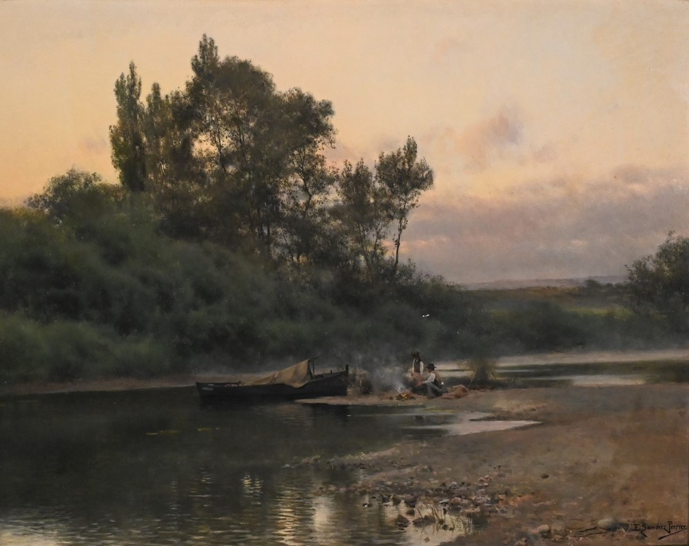 Emilio Sanchez Perrier (1855 – 1907), River Ulol, depicting two men encamped on river bank, signed lower right “E. Sanchez Perrier”, titled and dated on the back, 13″ x 16″. Provenance: Estate of James Dana English of New Haven to benefit the New Haven CT Museum.