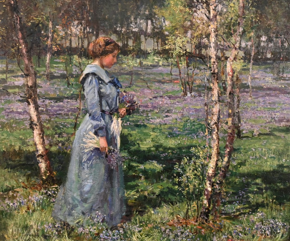Stanley Royle (Canadian, 1888 – 1961), Spring Morning Among the Bluebells, depicting the artist’s wife, oil on canvas, signed and dated lower left Stanley Royle, 1913, 25″ x 30″. Provenance: The artist’s family, Richard Green Gallery, London. Private collection, New York City, acquired from the above. Label on back with 1996 Richard Green receipt for $35,000.