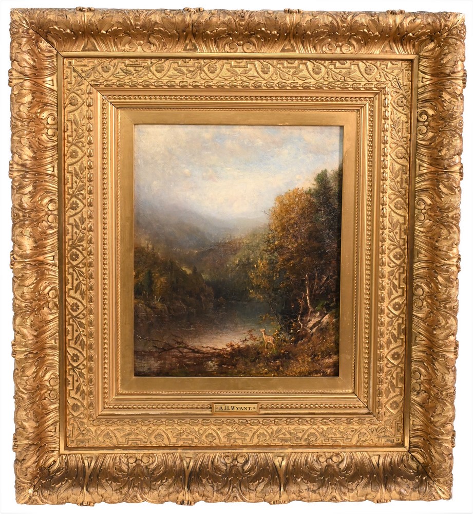 Alexander Helwig Wyant (1836 – 1892), fall landscape with deer, oil on canvas, signed lower right A.H. Wyant, in Victorian gilt frame, 12 5/8″ x 10 1/2″, Christie’s tag on back.