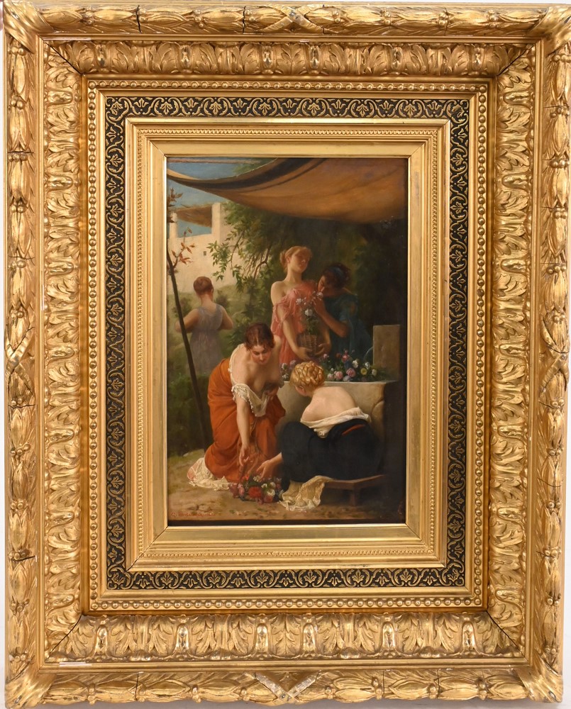 Gustave Clarence Rodolphe Boulanger (1824 – 1888), depicting four women with flowers having Orientalist style house in background, oil on panel, signed and dated lower left G. Boulanger 1868, in 19th century gilt frame, 16″ x 10″. Gustav Reichard’s Art Rooms label and Winsor & Newton Artists Colourmen label on back.