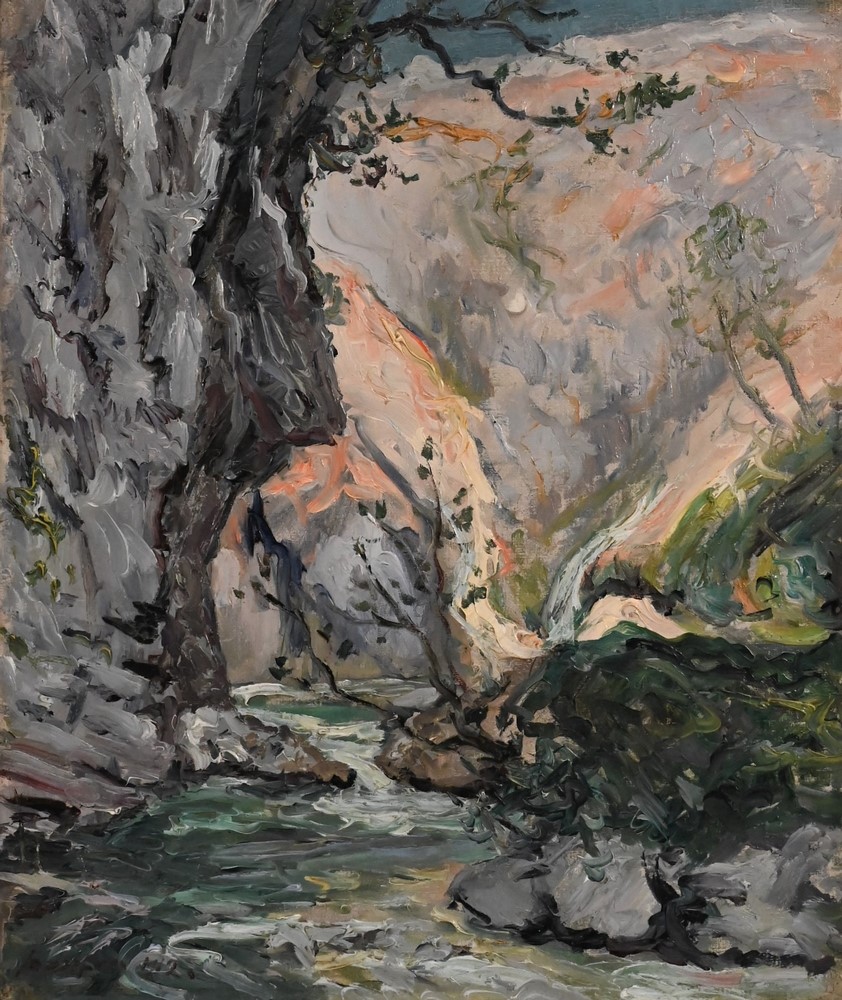 Maxine Camille Louis Maufra (1861 – 1918), Le Saut du Loup, oil on canvas, 21 3/4″ x 18 1/4″, signed and dated lower left Maufra 1912, titled on the stretcher, original Roland, Browse and Delbanco, London label on stretcher.