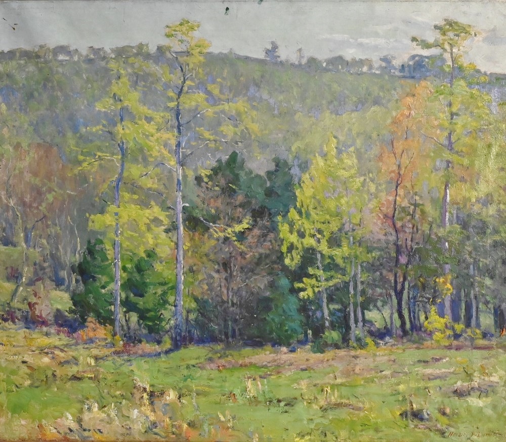 Harriet Randall Lumis (1870 – 1953), May in New England, oil on canvas, 24″ x 28″, signed lower right Harriet R. Lumis, titled and signed on stretcher.