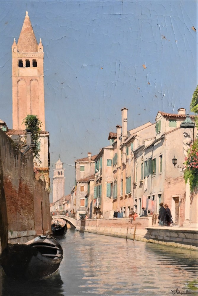 Vincenzo Caprile (1856 – 1936), Rio San Barnaba, Venezia, Venice Canal, oil on canvas, signed lower right V. Caprile, Sotheby’s label on back, lot #15, Milano, December 4, 2006. Sold 19,000 euros, estimate 25,000 – 35,000 euros, 30″ x 25 1/2″.
