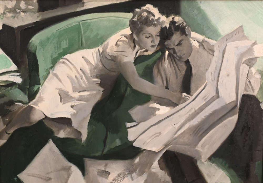 Edwin Henry (1900 – ), Green Couch, oil on canvas, illustration reading a newspaper on a green couch, intended for the story titled “Dark Purpose”, canvas marked not used, unsigned, 24″ x 34″, Illustration House label on back.