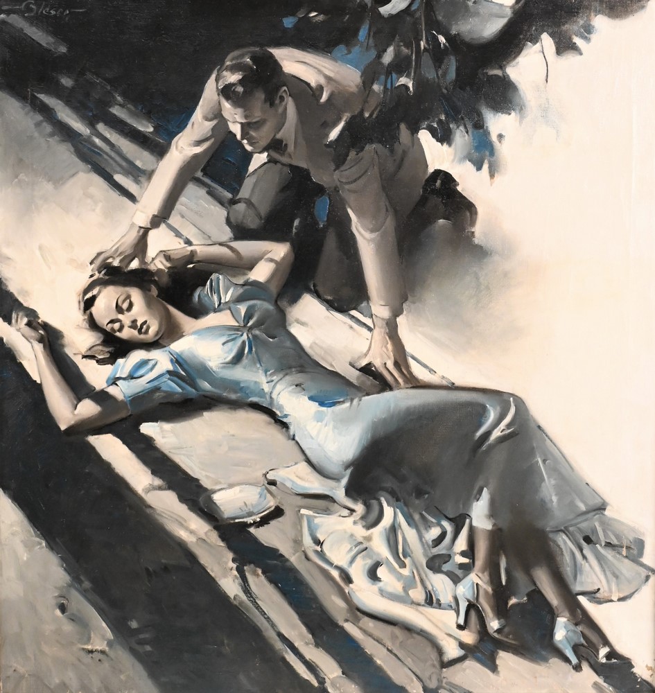 August Bleser Jr. (1898 – 1966), oil on canvas, story illustration man leaning over reclining woman “The Face” Redbook magazine, March 1938 in blue and black, signed upper left Bleser, sold at Illustration House November 2, 1991 with copy of invoice number 63, remnants of original paper label, 32 1/2″ x 30″.