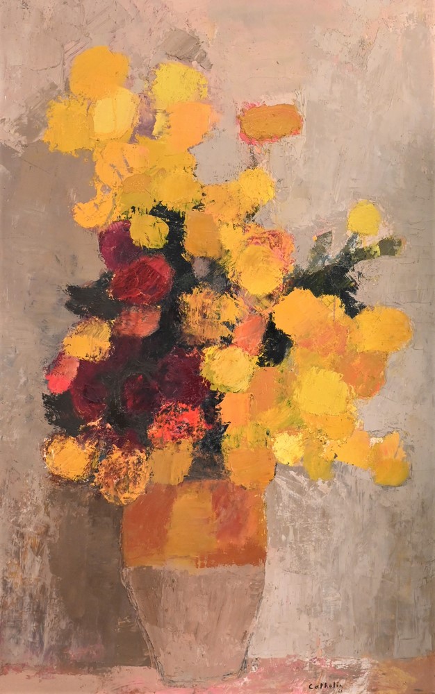 Bernard Cathelin (1919 – 2004), “Roses d’ Inde au Fond Gris, 1966″, still life of flowers in a vase, oil on canvas, signed and dated Cathelin 66 lower right, signed, dated and titled on the reverse, David Findlay Gallery label, 46″ x 29”.