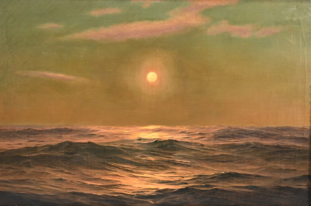 William Frederick Ritschel (1864 – 1949), Horse Cart on the Beach, oil on canvas, signed lower right W. Ritschel, in Newcomb Macklin gilt frame, relined, 16″ x 12″. Provenance: Mary Mullowney Sotheby’s Arcade sale 1318, lot 49.