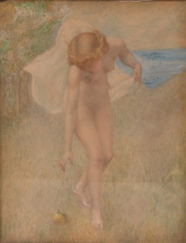 Gertrude L. Pew (1876 – 1949), Atlanta’s Race, 1912, watercolor on paper, depicting a nymph reaching for an apple, in bronze frame, signed lower right Gertrude L. Pew, heights 6 1/4″ x 4 3/4″. Provenance: Waterfront Estate, Stamford, Connecticut.