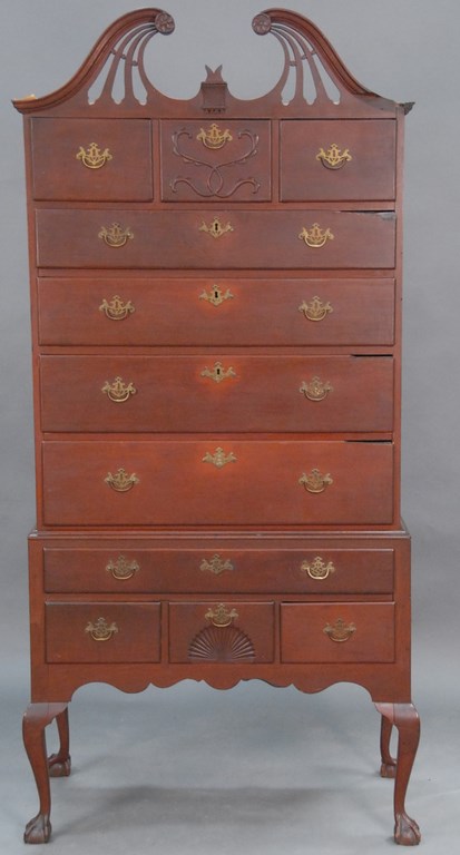 Chapin School high chest of drawers in two parts, upper section having broken pediment, pierced carved top over three short deep drawers over four long drawers on lower section with one long drawer over three short drawers over scalloped apron all set on cabriole legs ending in ball and claw feet, original hardware and old red finish, circa 1790 Connecticut River Valley. Top center drawer has typical vine carving lower center drawer with fan carving. Cherry and Eastern white pine. ht. 80 1/4in. upper case ht. 49 5/8in. wd. 35 3/8in. dp. 18 1/8in. lower case ht. 30 5/8in. wd. 37 3/8in. dp. 19 1/8in. Photographed in Connecticut Valley Furniture by Thomas and Alice Kugelman and Robert Lionetti, Catalog #82, page 187, Windsor, Connecticut Provenance: Timothy Phelps and Ruth Wilson, married 1785 Cyrus Howe and Sally Phelps Edward Thrall and Flavia Howe George Merwin and Leliane Thrall Hubbel Brown and Dorothy Merwin Elizebeth Bowman and Edward Brown born 1932 to present owners
