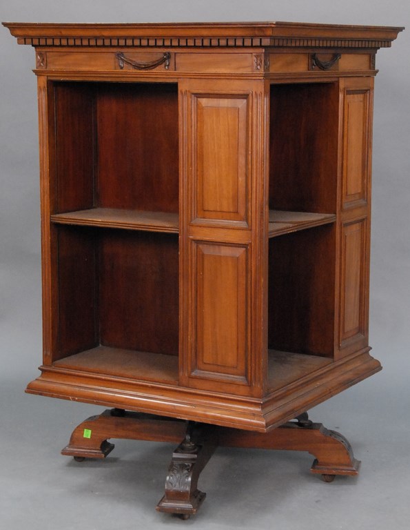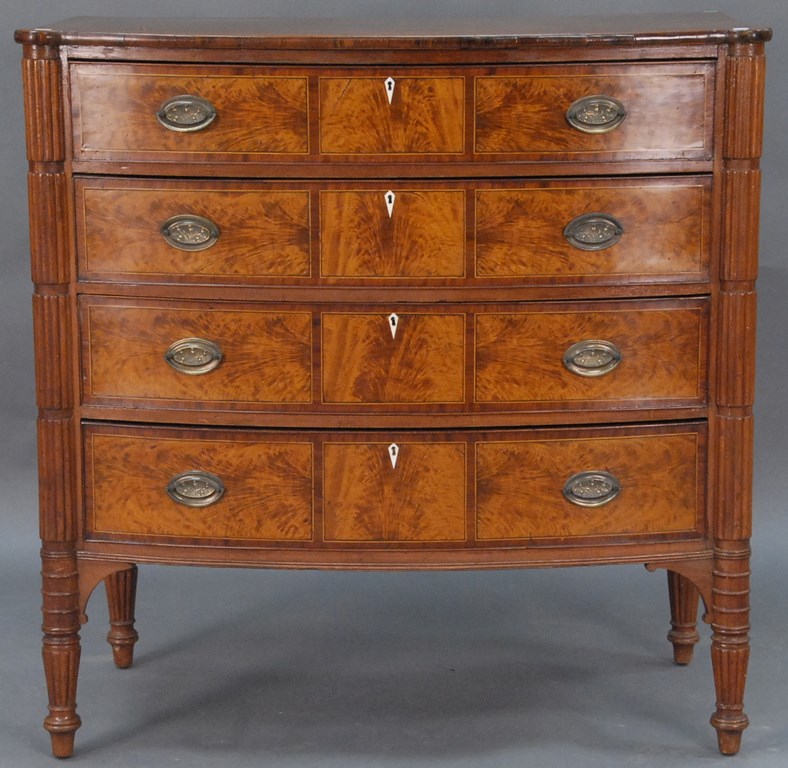 Sheraton mahogany chest, top with bowed front and cookie corners over conforming chest of four drawers each with three burlwood panels framed with inlays all set on turned and fluted legs, circa 1830. ht. 42in. wd. 40in. dp. 20in.