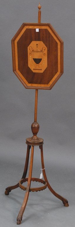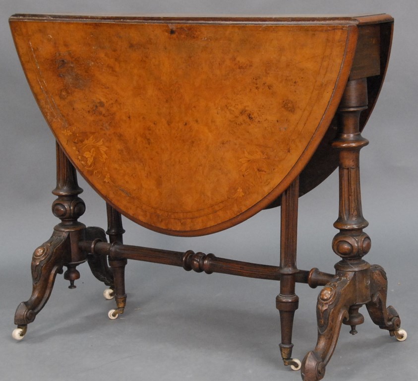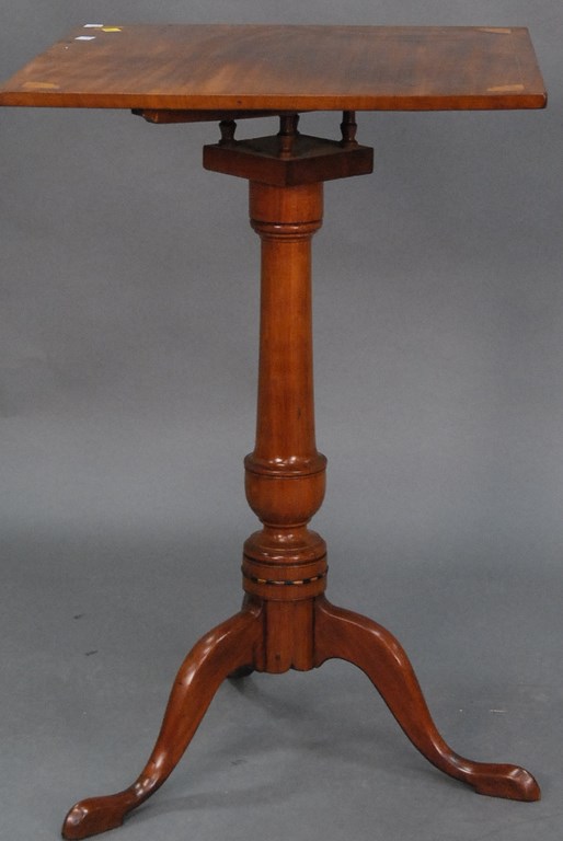 Federal cherry game table having serpentine top on conforming skirt set on square tapered legs, small center drawer in skirt, and secret drawer behind swing leg all with wide line inlay, Connecticut circa 1790. ht. 27in. wd. 33in.