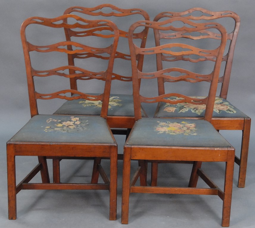Set of four Chippendale chairs with pierced ladderbacks and slip seats on square legs with stretchers, circa 1780. ht. 38in. seat ht. 17in. Provenance: Phelps-Brown Family, Windsor, Connecticut