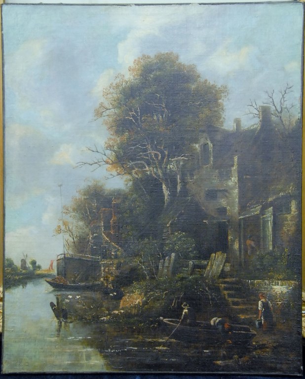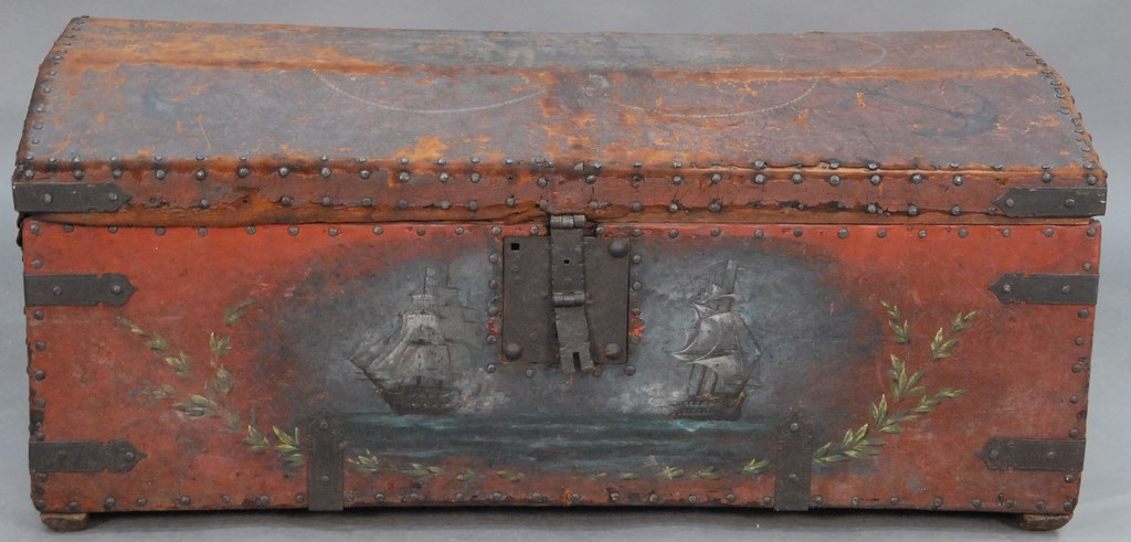 Continental lift top chest with domed top, original leather covering front with hand painted scene of two war ships in battle, top painted with surrender of one of the captains, all with etched iron hardware, iron tacks, and iron handles, 18th to early 19th century, possibly British and Russian warships from the Crimean War. ht. 19in. lg. 45in. wd. 25in.