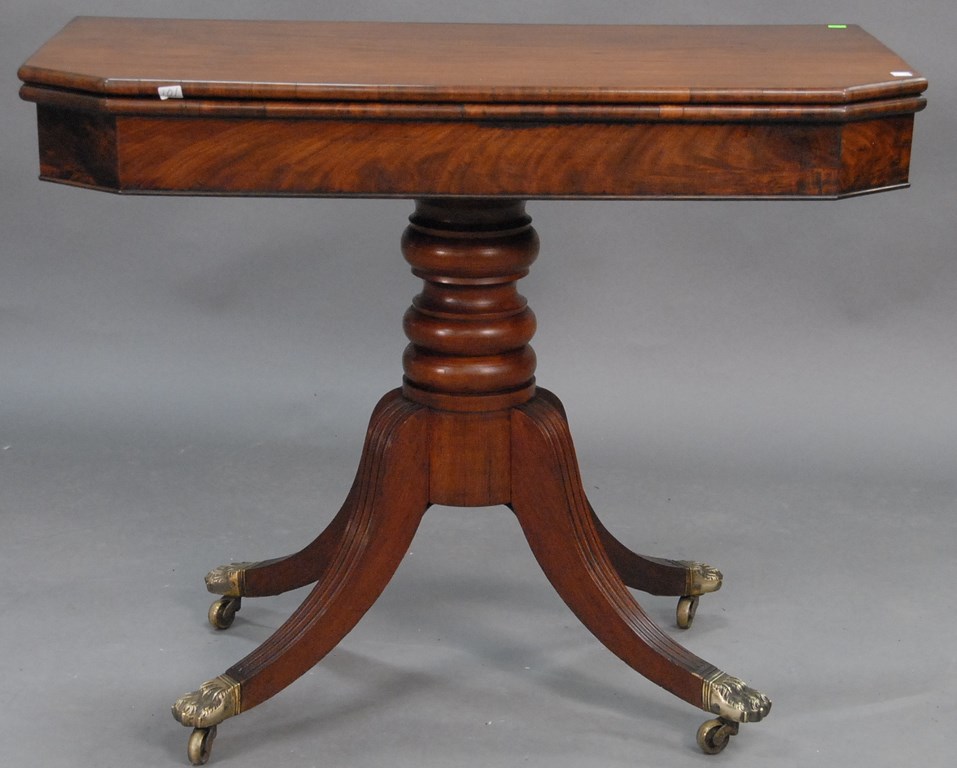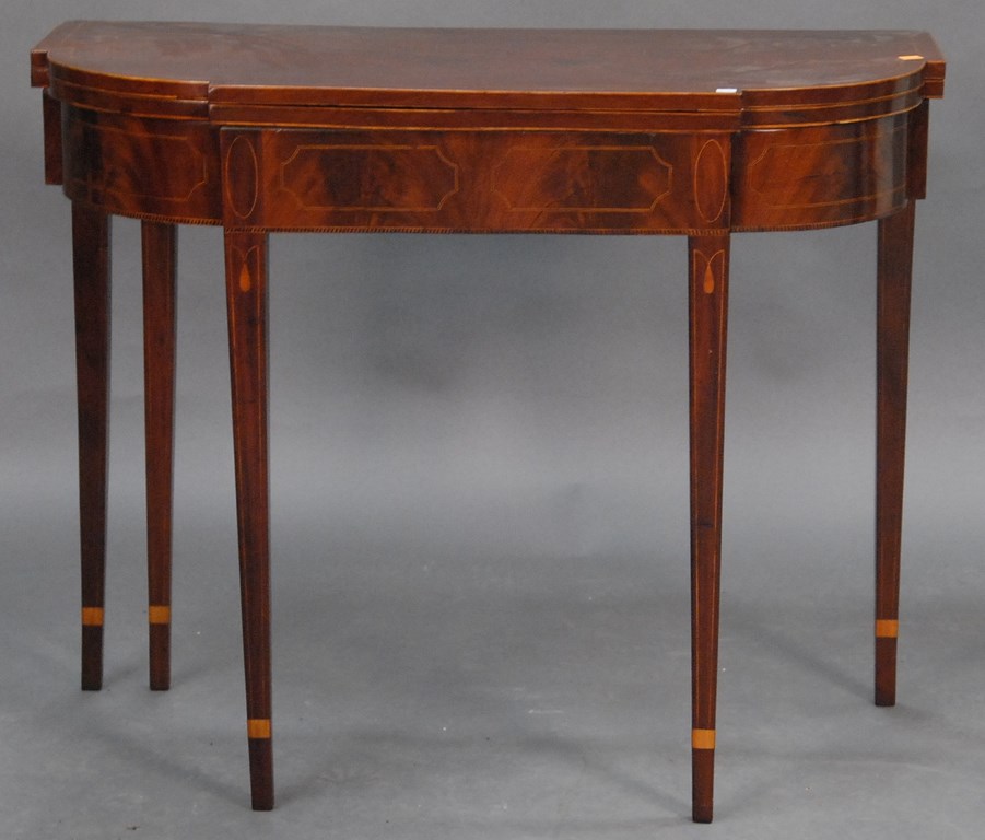 Federal mahogany game table, D shaped top over conforming frieze on square tapered legs with line, panel, and drop inlays, circa 1790. ht. 29in. top open: 36 x 17 1/2