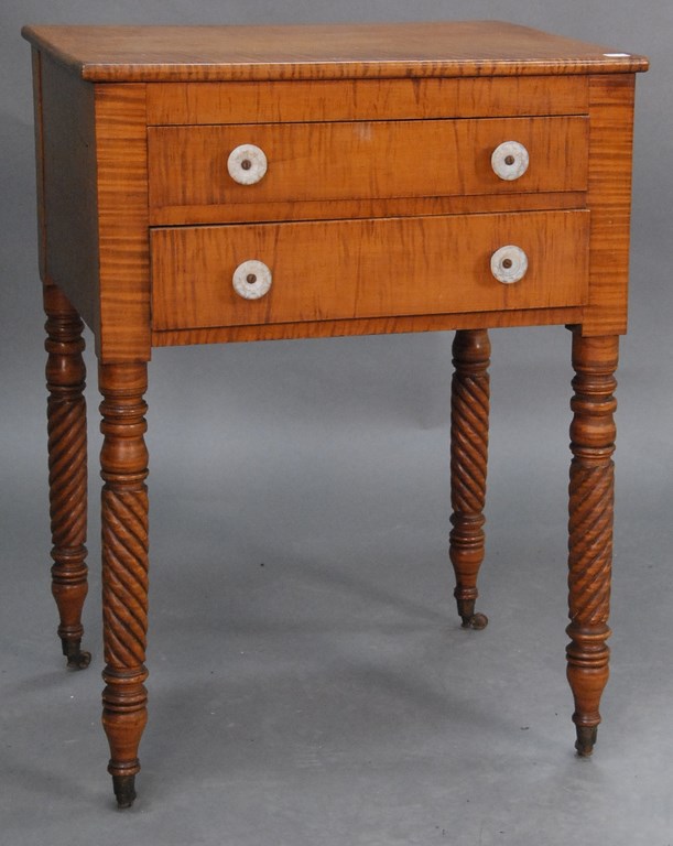Tiger maple Sheraton stand having two drawers with opalescent glass pulls on spiral turned legs ending in brass capped feet with wheels, circa 1830-1840. ht. 28in. top: 18 x 21