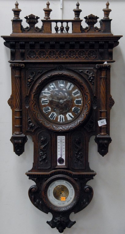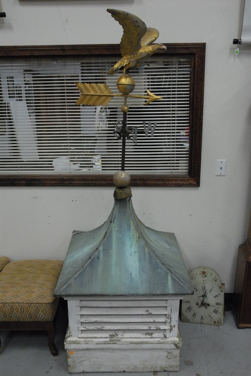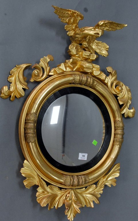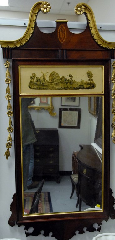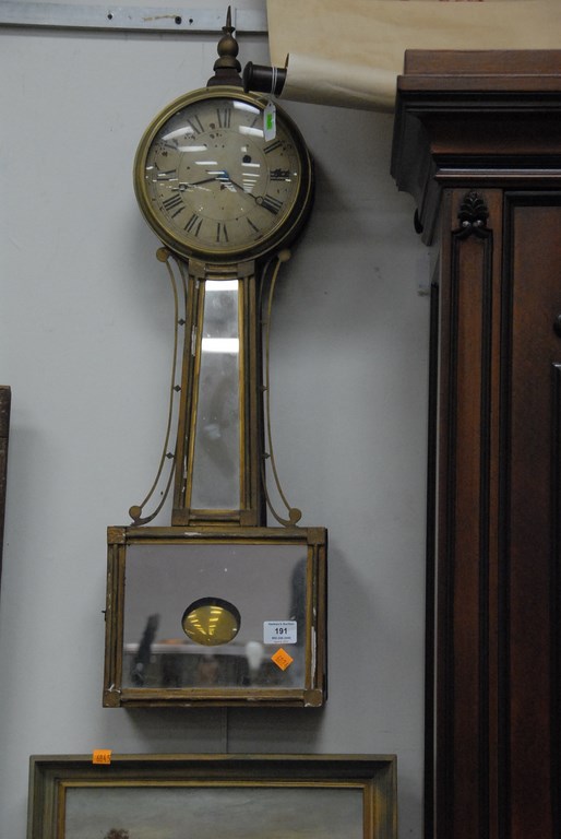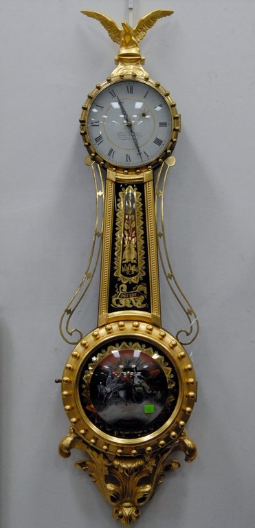 Elmer Stennes girandole clock in the manner of Curtiss, weight driven, top with gilt eagle finial, gilt trimmed bowed throat glass and bowed lower glass reverse painted Aurora with leafy scroll base. ht. 46in. wd. 12in.