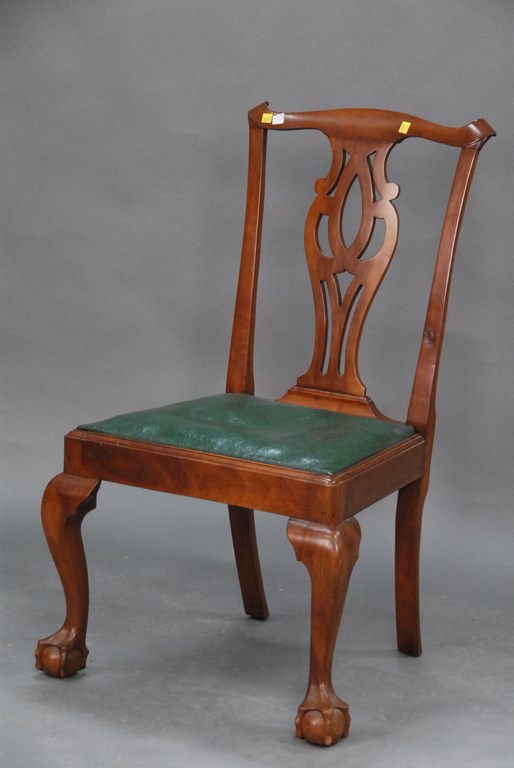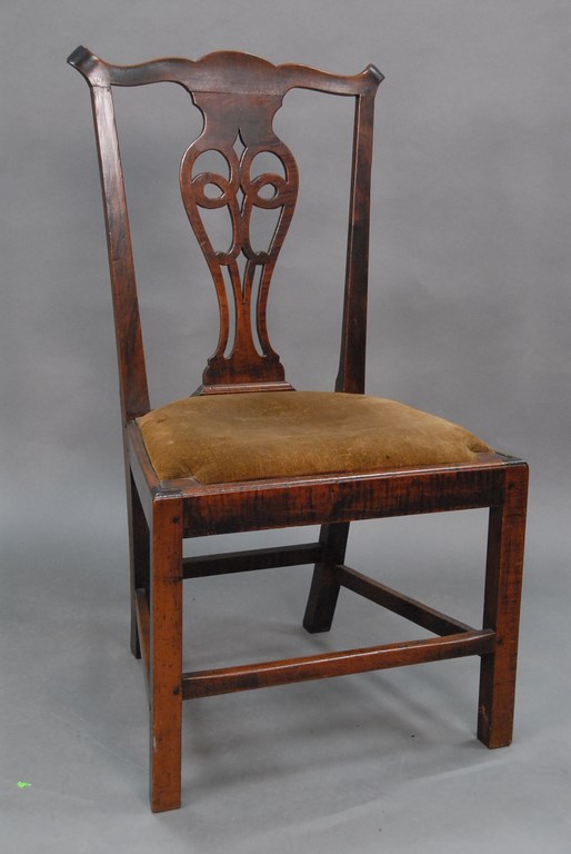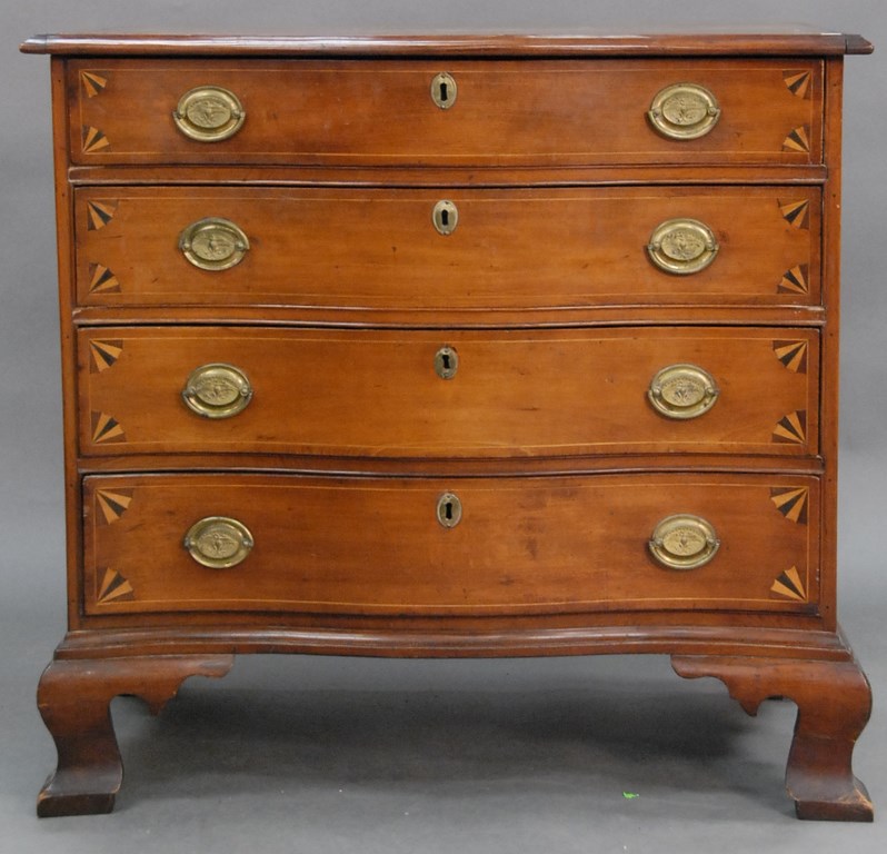 Cherry serpentine front chest having shaped top over conforming case of four drawers all set on ogee bracket feet, top with applied ends, drawers having large fan inlays feet spliced. ht. 33in. wd. 32 3/4in. dp. 20 1/2in. Provenance: Estate of Nancy Sachse, Hamden, Connecticut