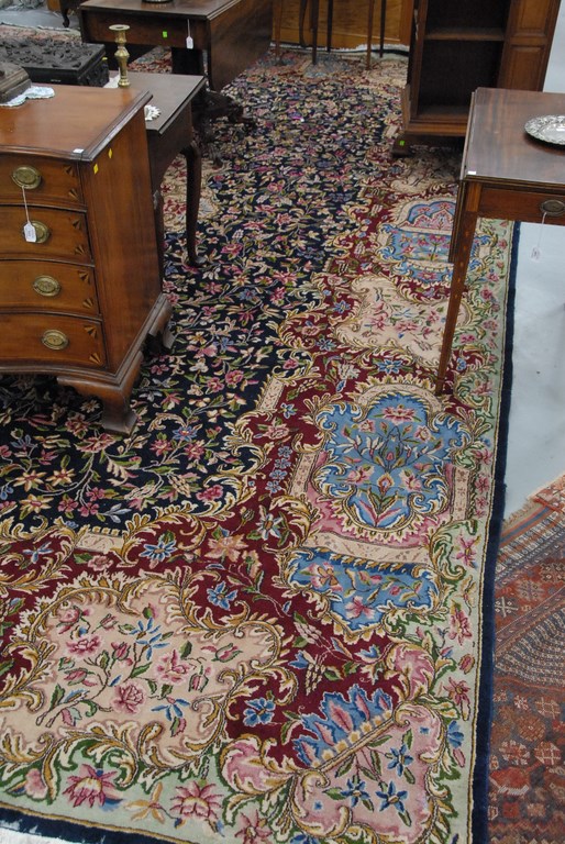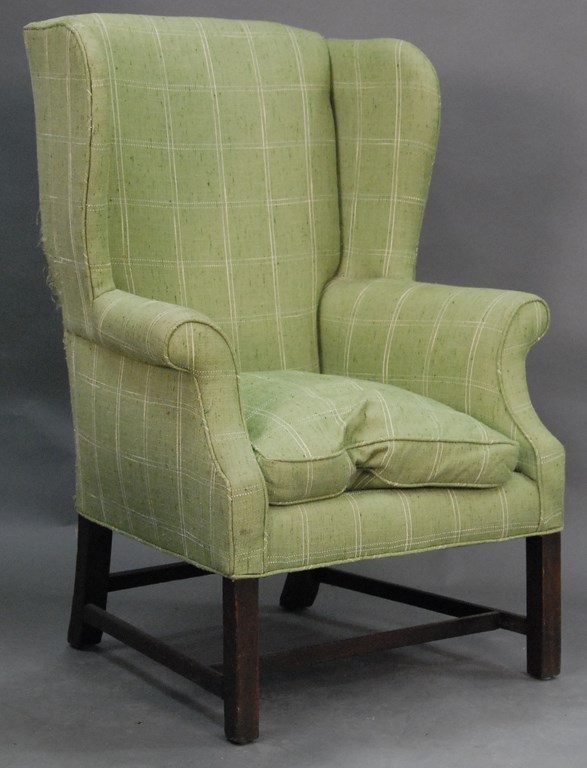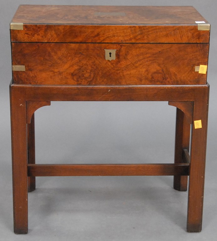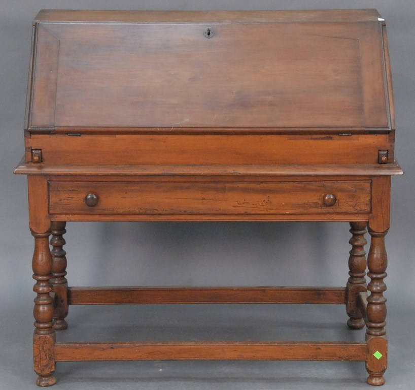 Queen Anne cherry desk on frame in two parts, upper section with slant lid desk over one drawer on base with turned legs and square stretcher, interior with well and four drawers, circa 1740. ht. 40in. wd. 40in.