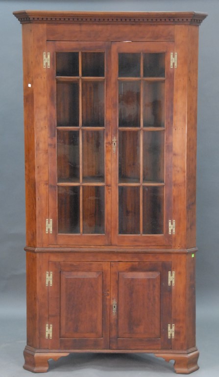 Two part corner cupboard, upper section with cornice molding over two glazed doors on base with two blind doors on ogee feet. ht. 86in. wd. 43in. dp. 19in.