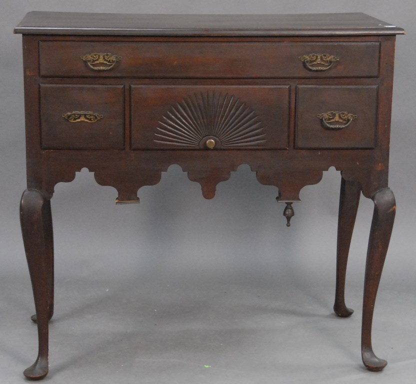 Queen Anne highboy base with long drawer over three short drawers with highly scalloped skirt on cabriole legs ending in pad feet. ht. 37in. wd. 37in. dp. 18in.