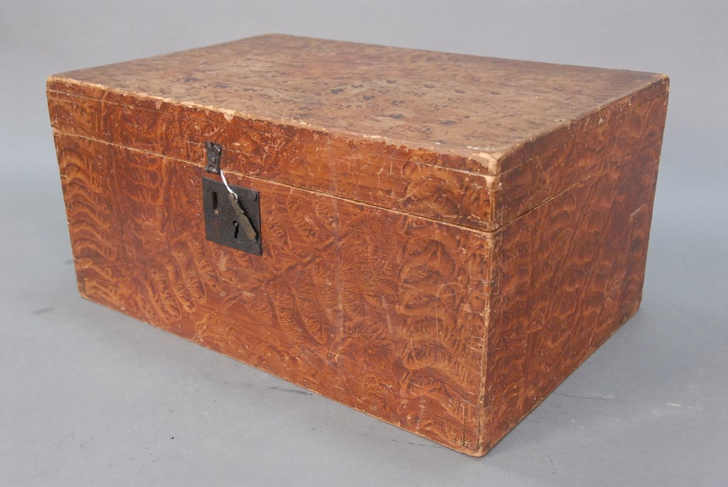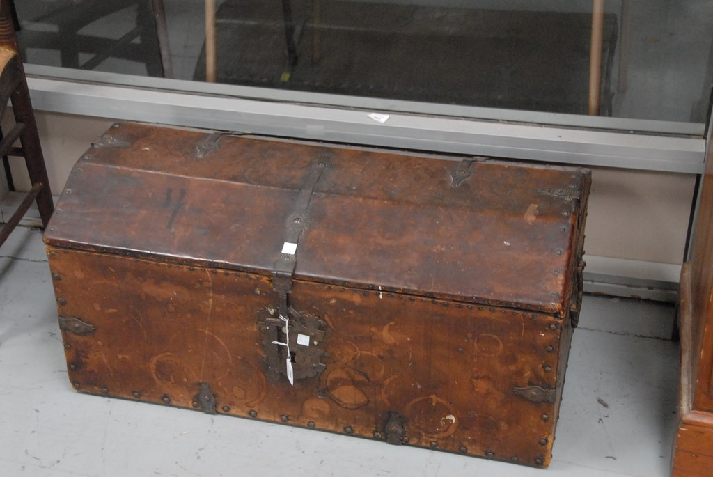 Primitive trunk having domed top all in original brown leather covering with iron hardware and tacks, 18th century Continental. ht. 16in. lg. 33in. dp. 18in.