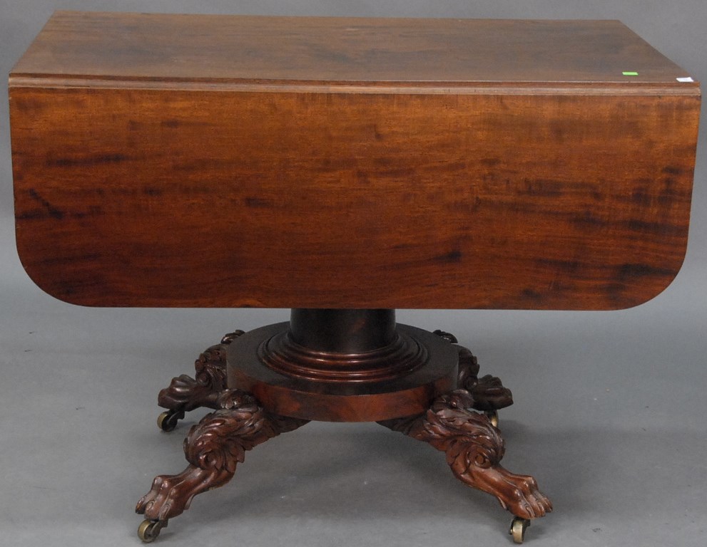 Federal mahogany drop leaf table on plain circular pedestal base and carved paw feet, circa 1840. ht. 29in. lg. 48in. dp. 38in. Provenance: Brown Family, Windsor, Connecticut